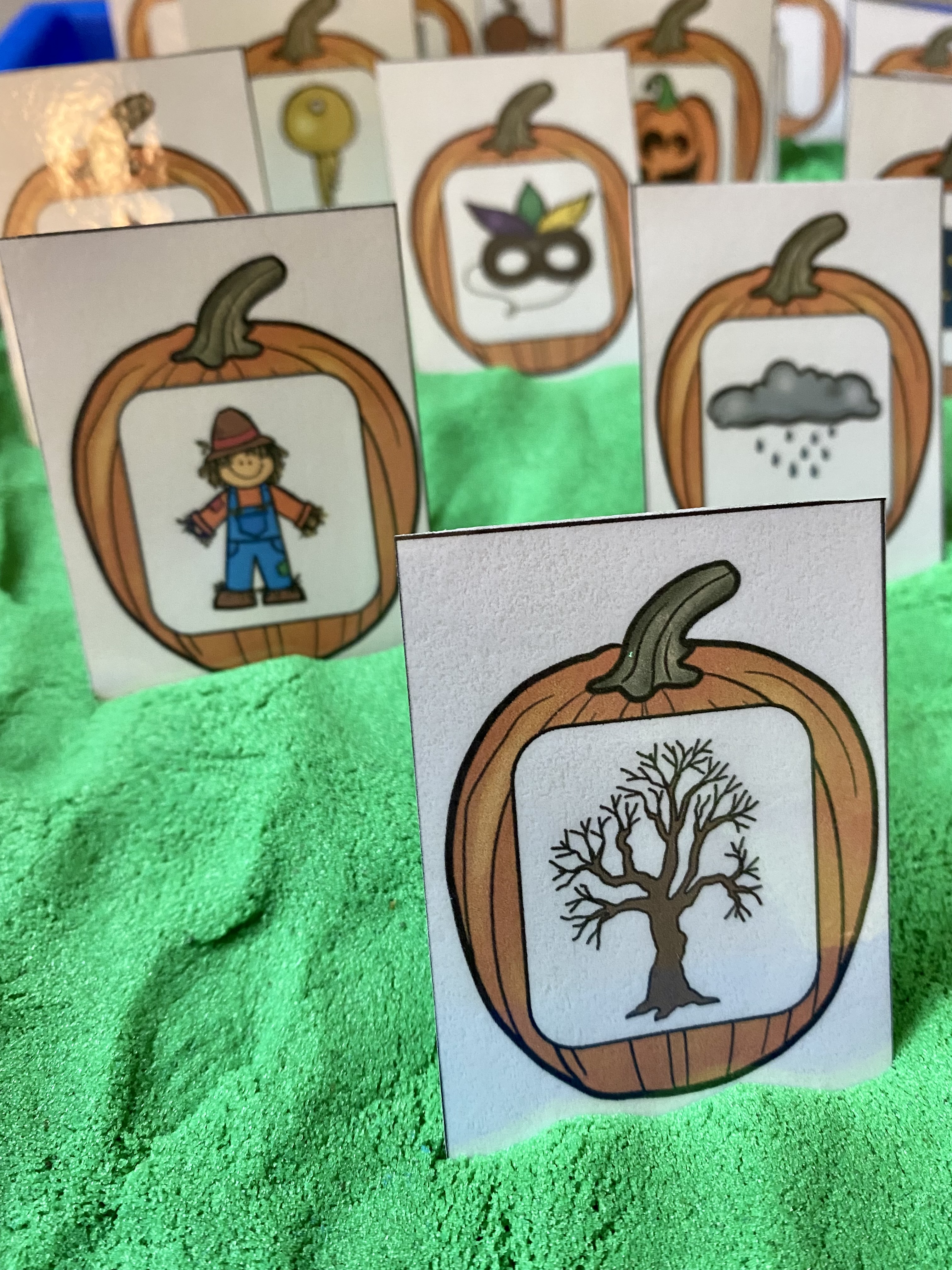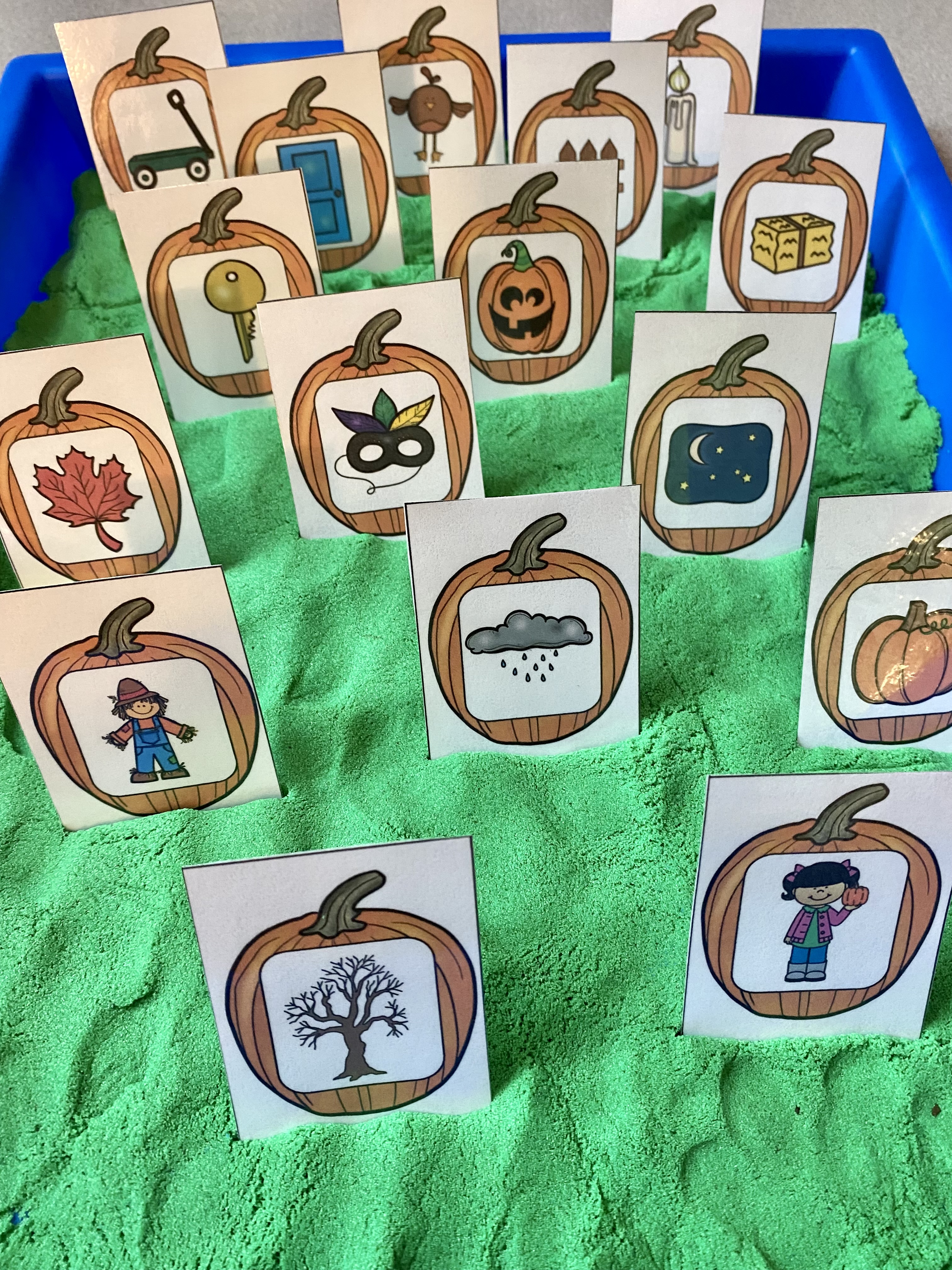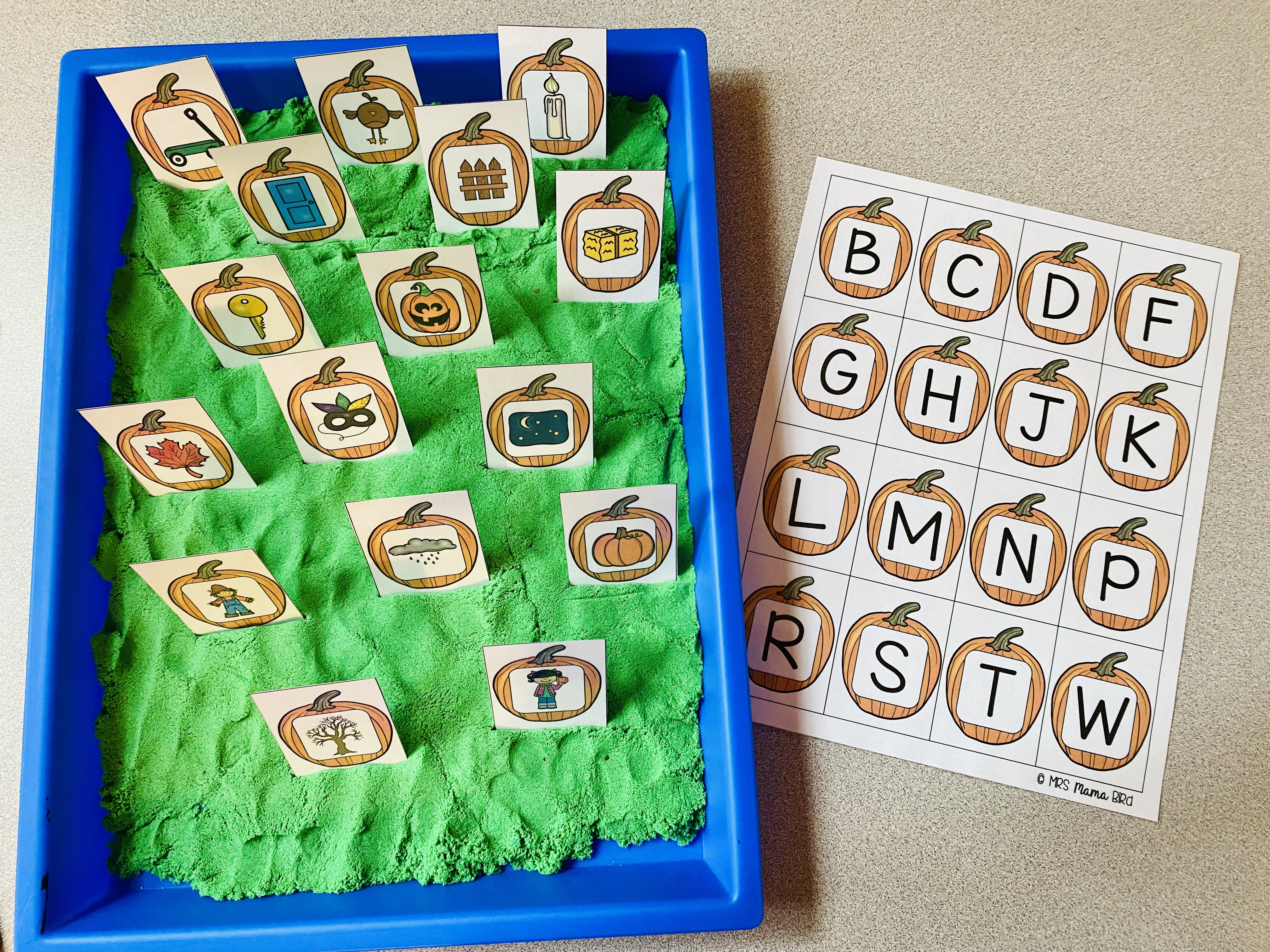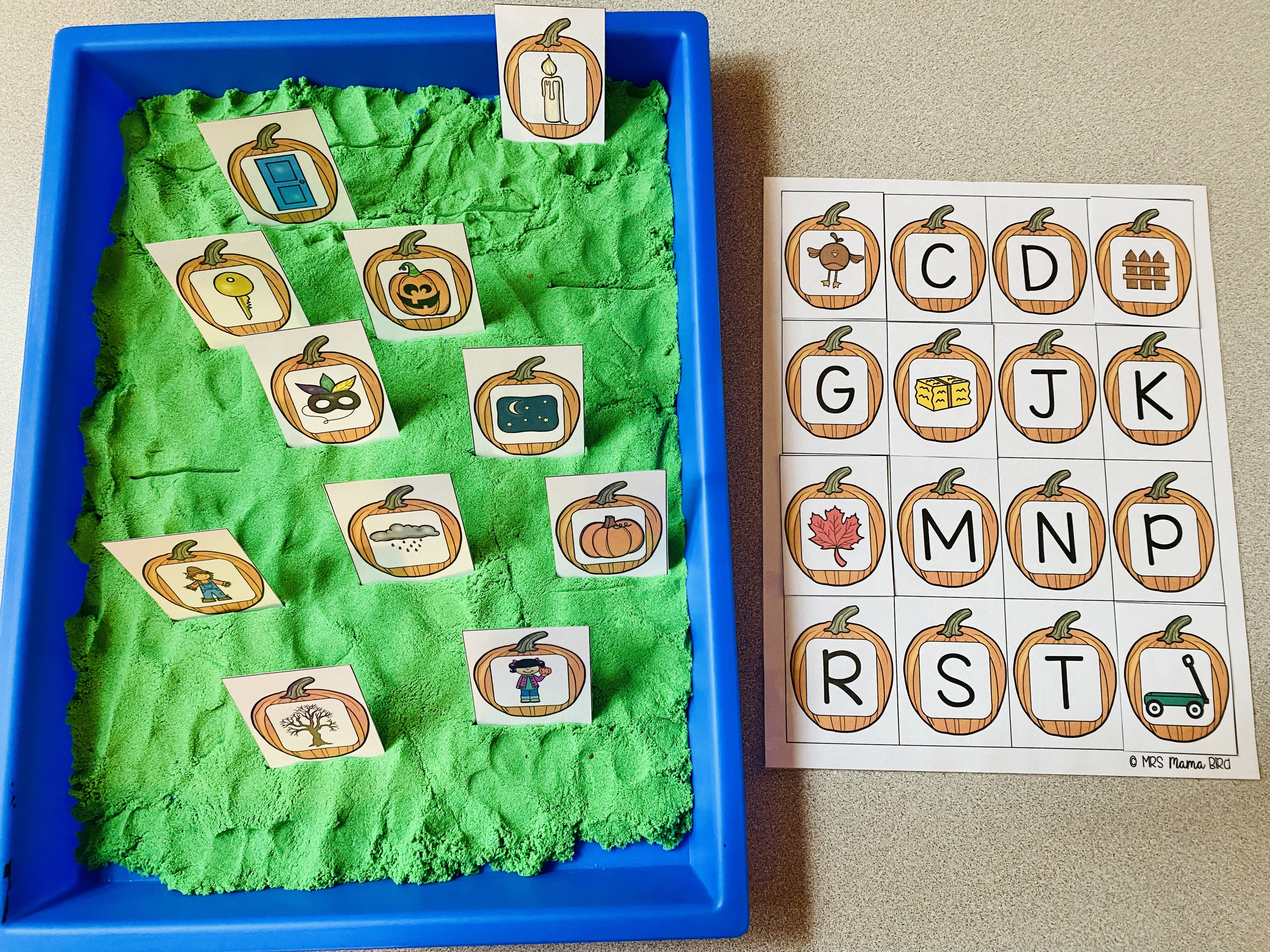 I decided to set this letter sound match center up like a pumpkin patch. I used kinetic sand as the ground and spread it evenly in a deep plastic tray that I purchased at Michaels. Kinetic sand is one of my favorite sensory activity mediums because it isn’t sticky!!! It doesn’t dry up if you leave it out. And if it does fall on the floor, it vacuums or sweeps right up. Kids love it too which is really the most important part.