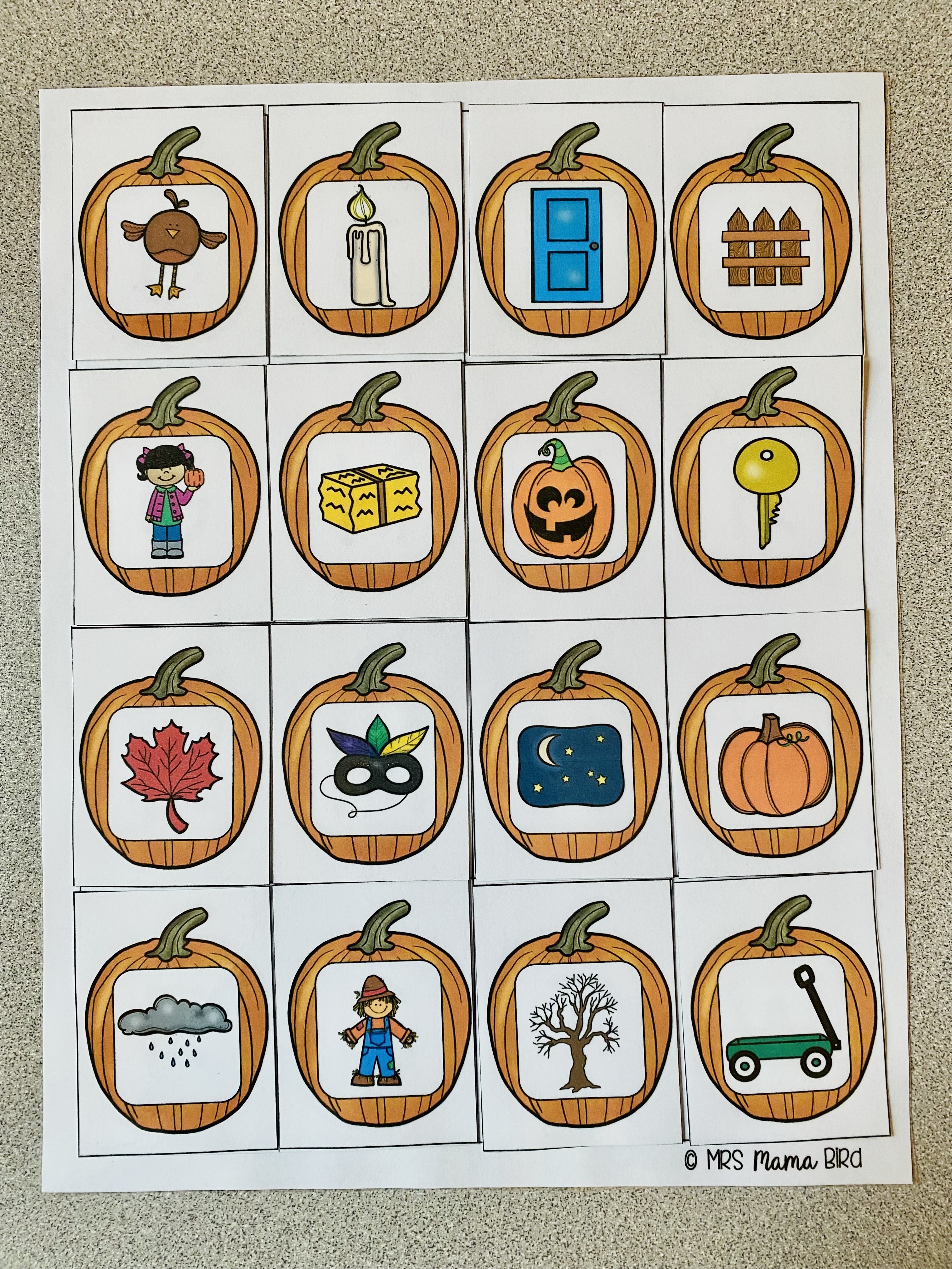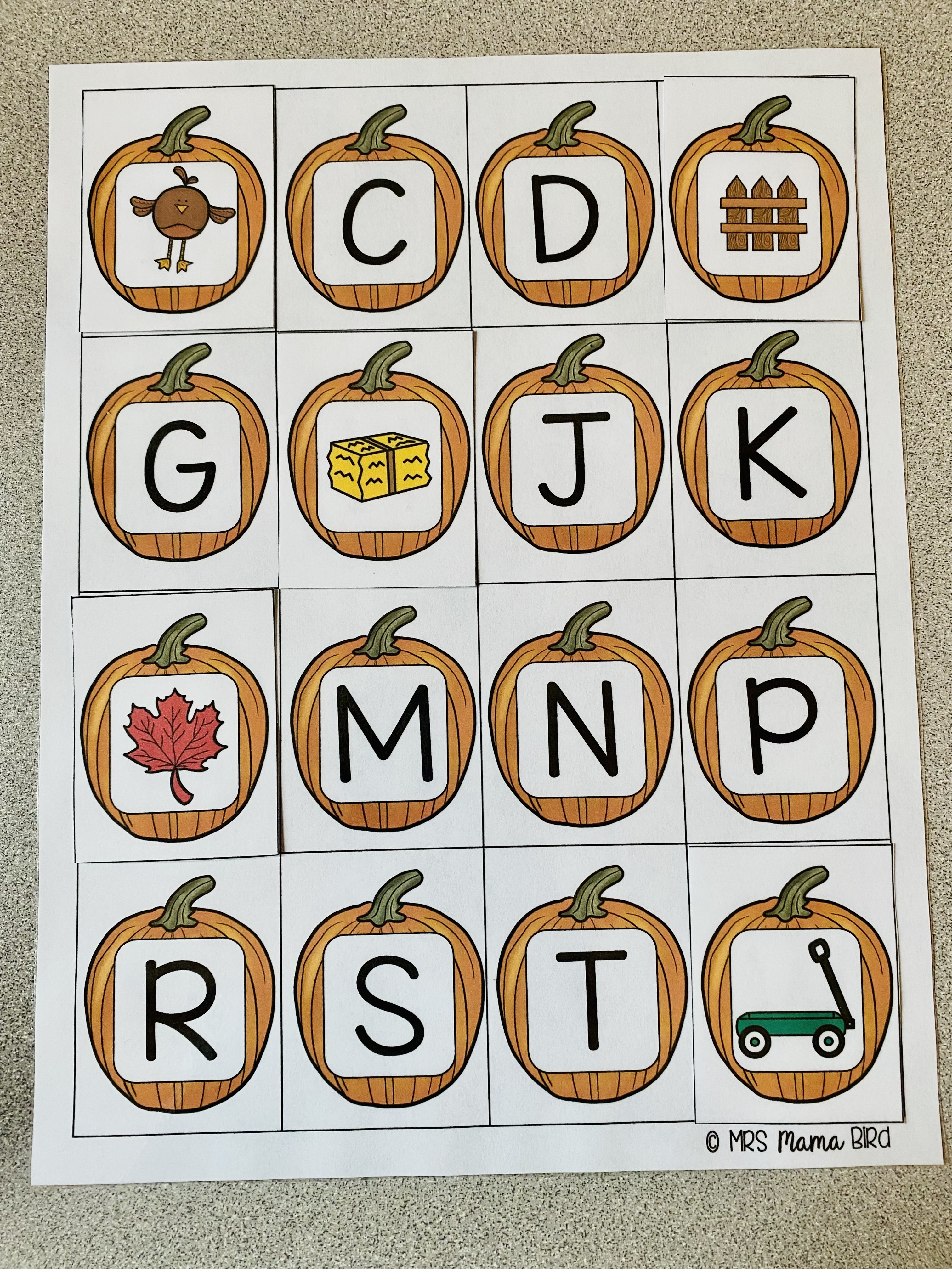 Next, I cut apart the pumpkin sound cards and positioned them in the “ground” as if they were growing in a pumpkin patch. They are staggered so that they are easy to view for the child sitting at the center. Each card depicts a pumpkin with a different picture in the middle. This activity focused on the beginning sound of each picture. In order for my preschooler, Emmett, to keep track of the letter sounds he found, I printed the letter mat and set it next to the “pumpkin patch” of pumpkin sound cards. This kept Emmett’s sound cards organized as he picked each pumpkin and identified the beginning sound of the picture.