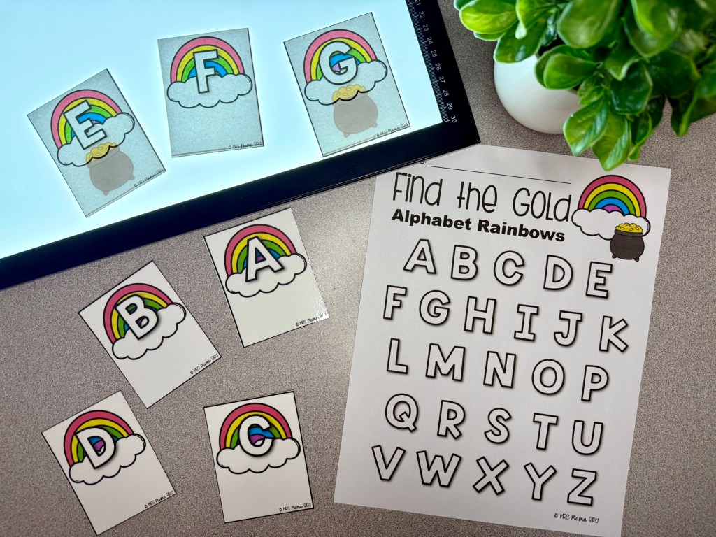 We use this light tablet for light activities because I love how it lays flat on the table and multiple children can utilize it at once. If you prefer, you can use hand held flashlights and they will work just the same. You can also set up this activity near a window and have your preschoolers hold the cards against the window to reveal the pots of gold. Whatever works best for you!