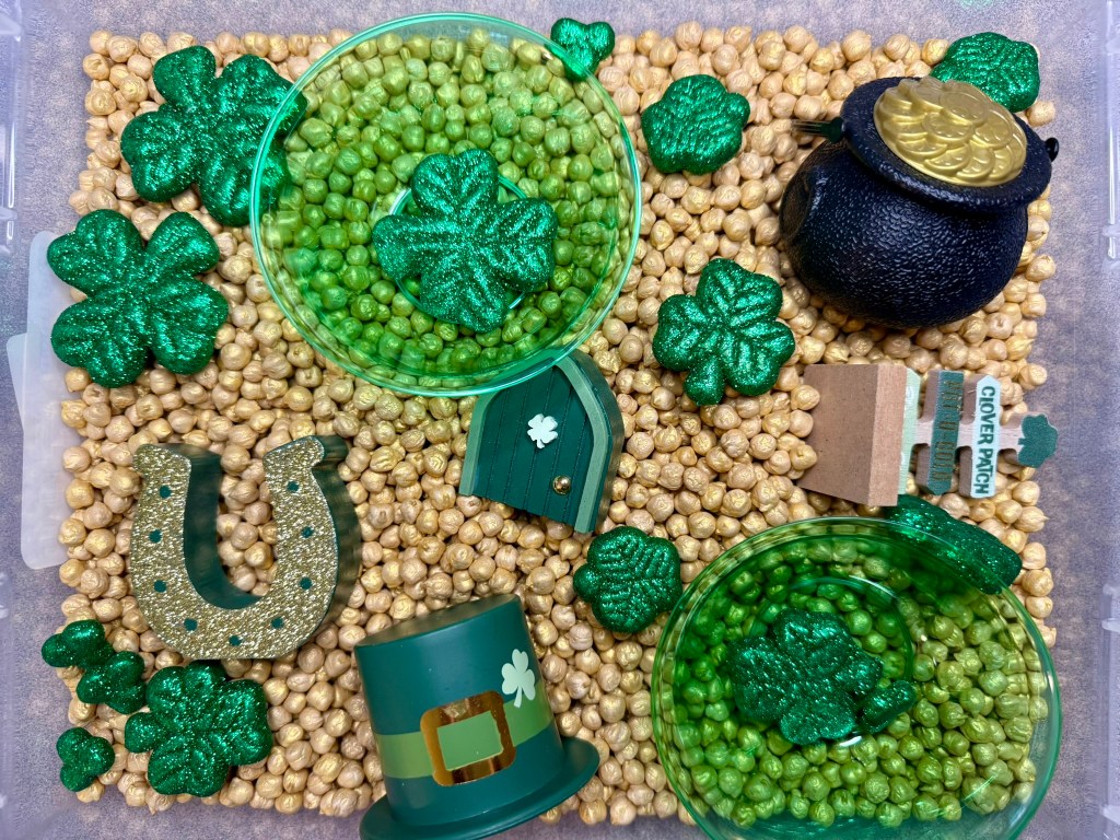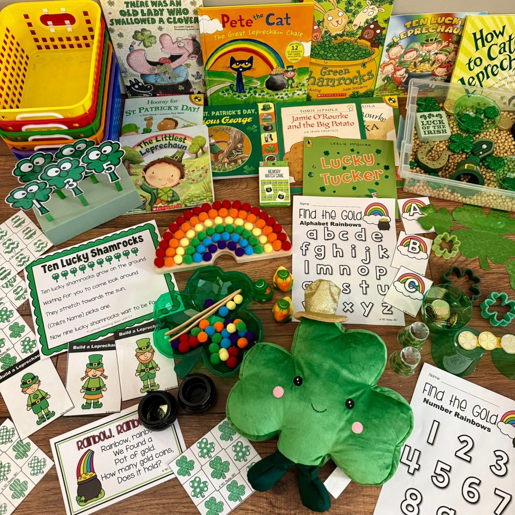 March is finally here!! There is always something so refreshing about the start of March. Warmer weather is just around the corner and it’s time to start thinking about all the spring things, including St. Patrick’s Day! For those of you who don’t know, I am a Teaching Totes Specialist. I love putting together play-based learning kits for preschoolers that are available to rent in my area. But for those of you who are not local to me, I love sharing the elements of my Teaching Totes so that you can recreate your favorites for the little learners in your life!