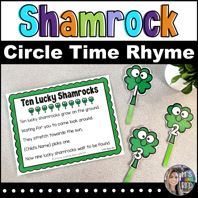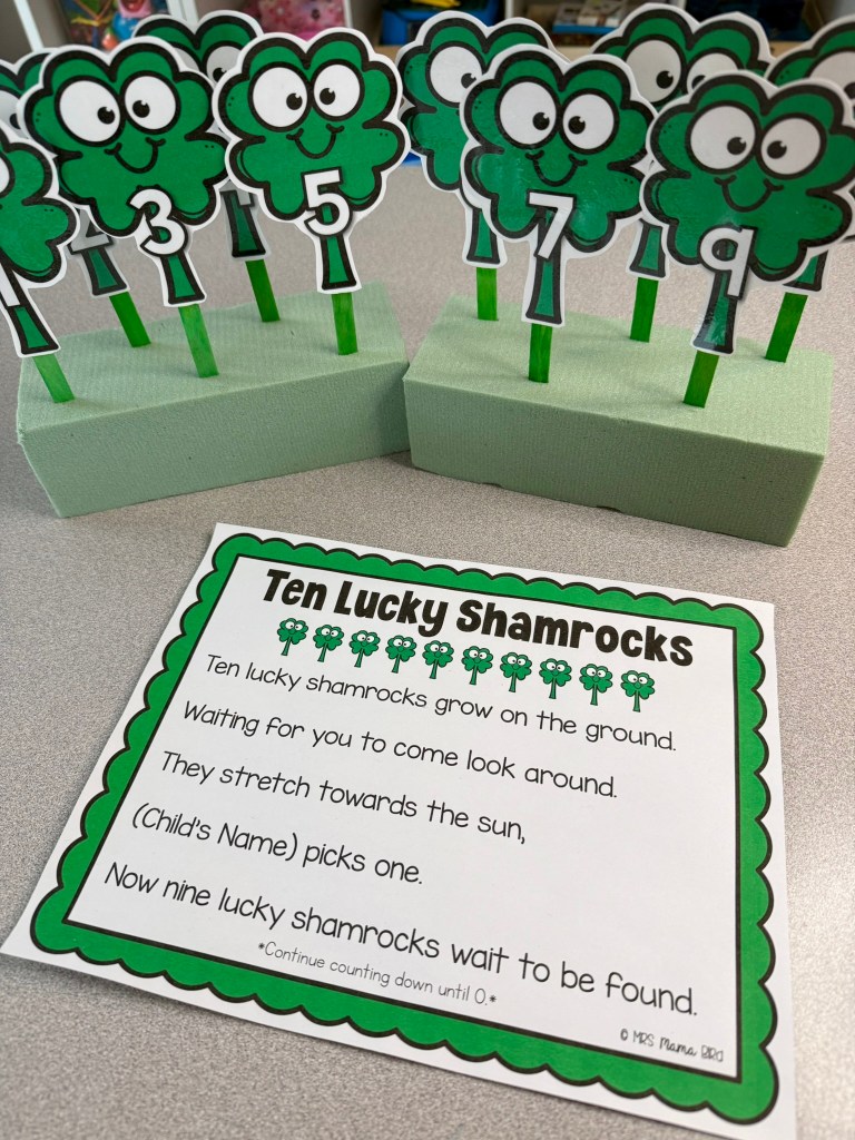 Another counting activity that I’ve included in the St. Patrick’s Day Teaching Tote is this 10 Lucky Shamrocks Rhyme. You can count down from 10 or 5, whatever is best for your little learners. Use the shamrocks on a stick to act out the verses and substitute the names of your own preschoolers as you say the rhyme together. It’s easy to add a little motion to the rhyme as well. This is how it goes.