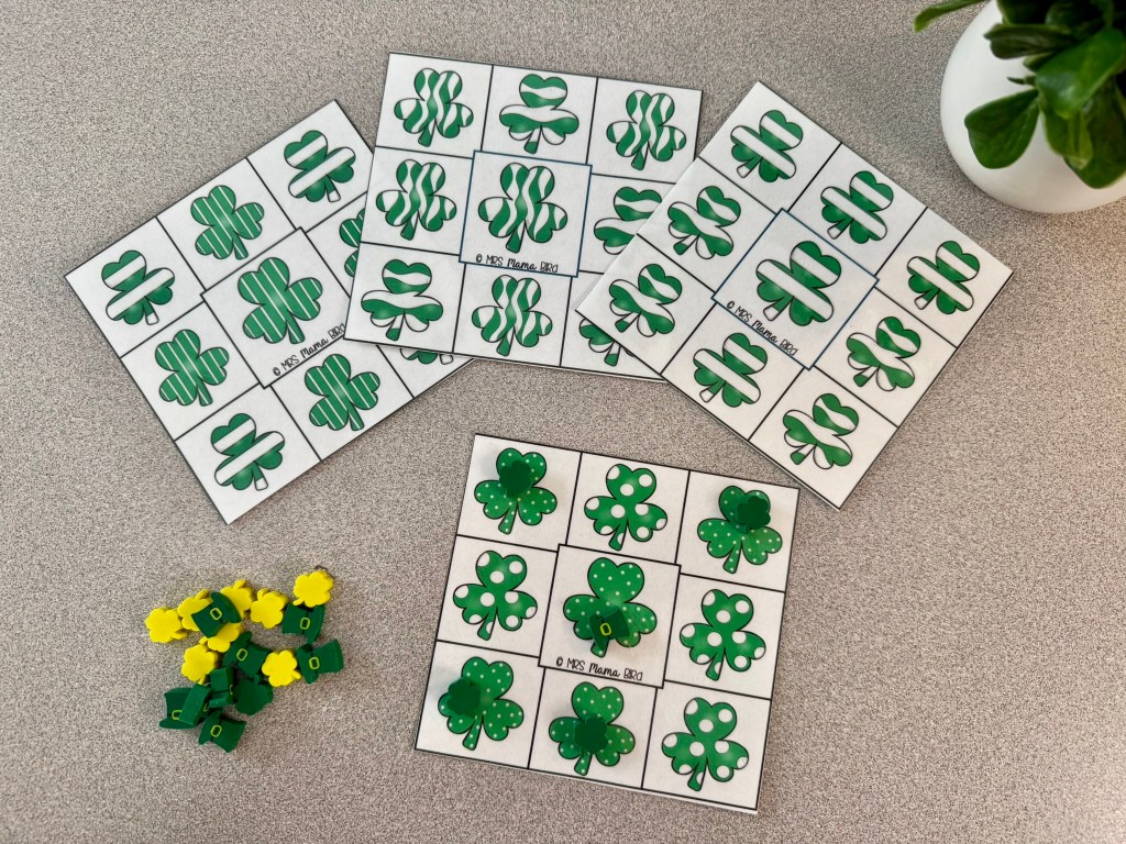 Speaking of FREEBIES, here’s another Teaching Tote activity that is also free in my TpT shop. These Shamrock Match the Middle Cards are a great way to practice visual discrimination. Your preschooler can look at the shamrock in the middle of each card and identify the shamrocks that match that one in the middle exactly. Use festive loose parts or clips to cover the matching shamrocks. This will also help strengthen those fine motor skills too!