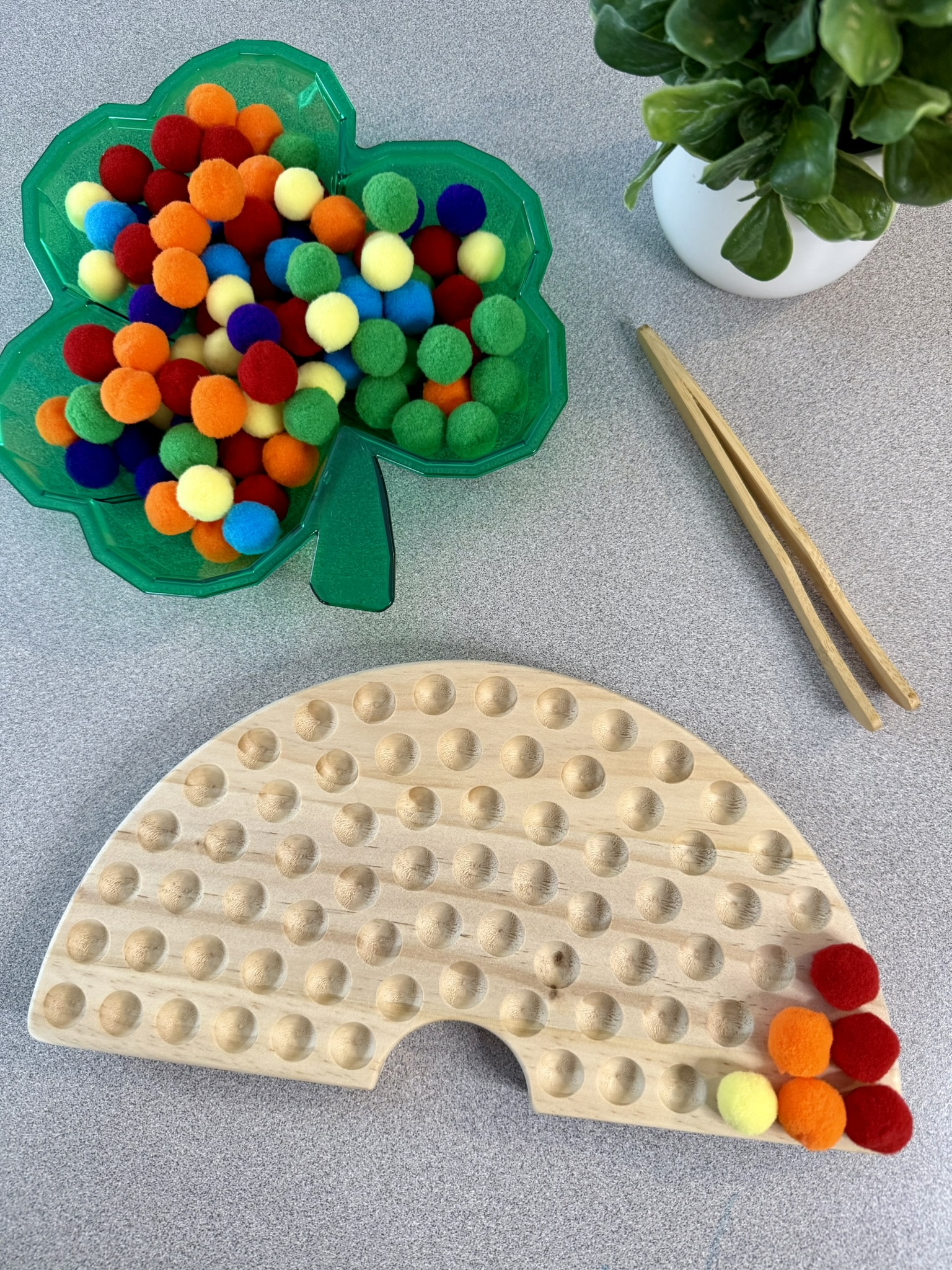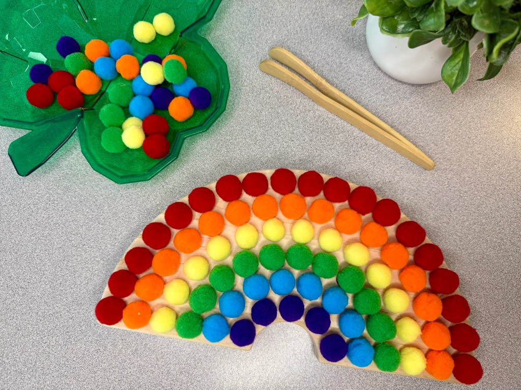 Speaking of fine motor skills, here is an amazing way to strengthen the muscles in little hands!! This wooden rainbow has spaces that will hold little color pom poms. Your preschooler can use the tongs to carefully place each pom pom in the desired place. They can choose to create a traditional rainbow or their own colorful design. If your preschooler doesn’t want to attend to this activity long enough to fill all the holes, try taking turns with them so that you carry some of the burden of filling it in. This will encourage building stamina and lengthening attention span.
