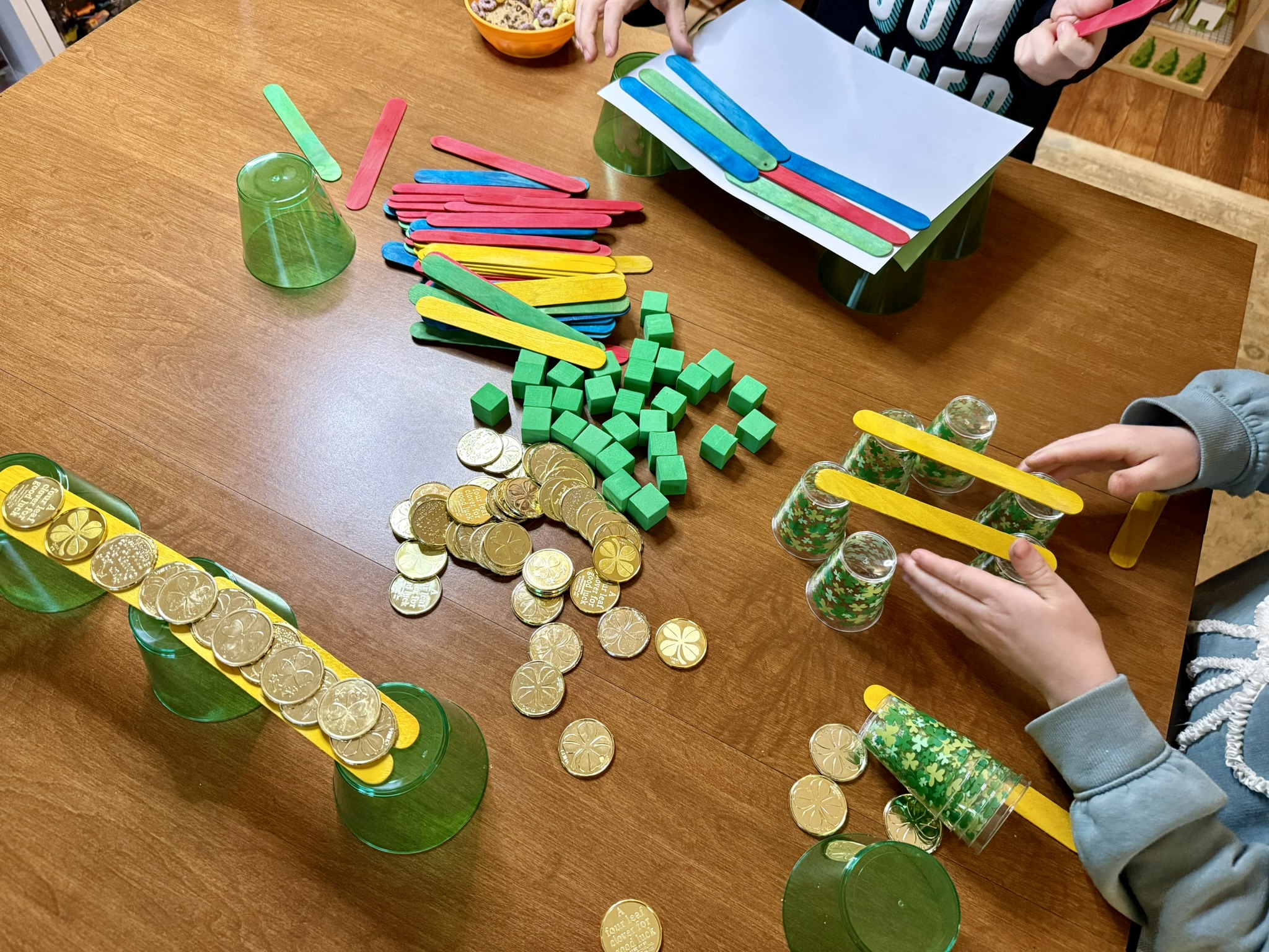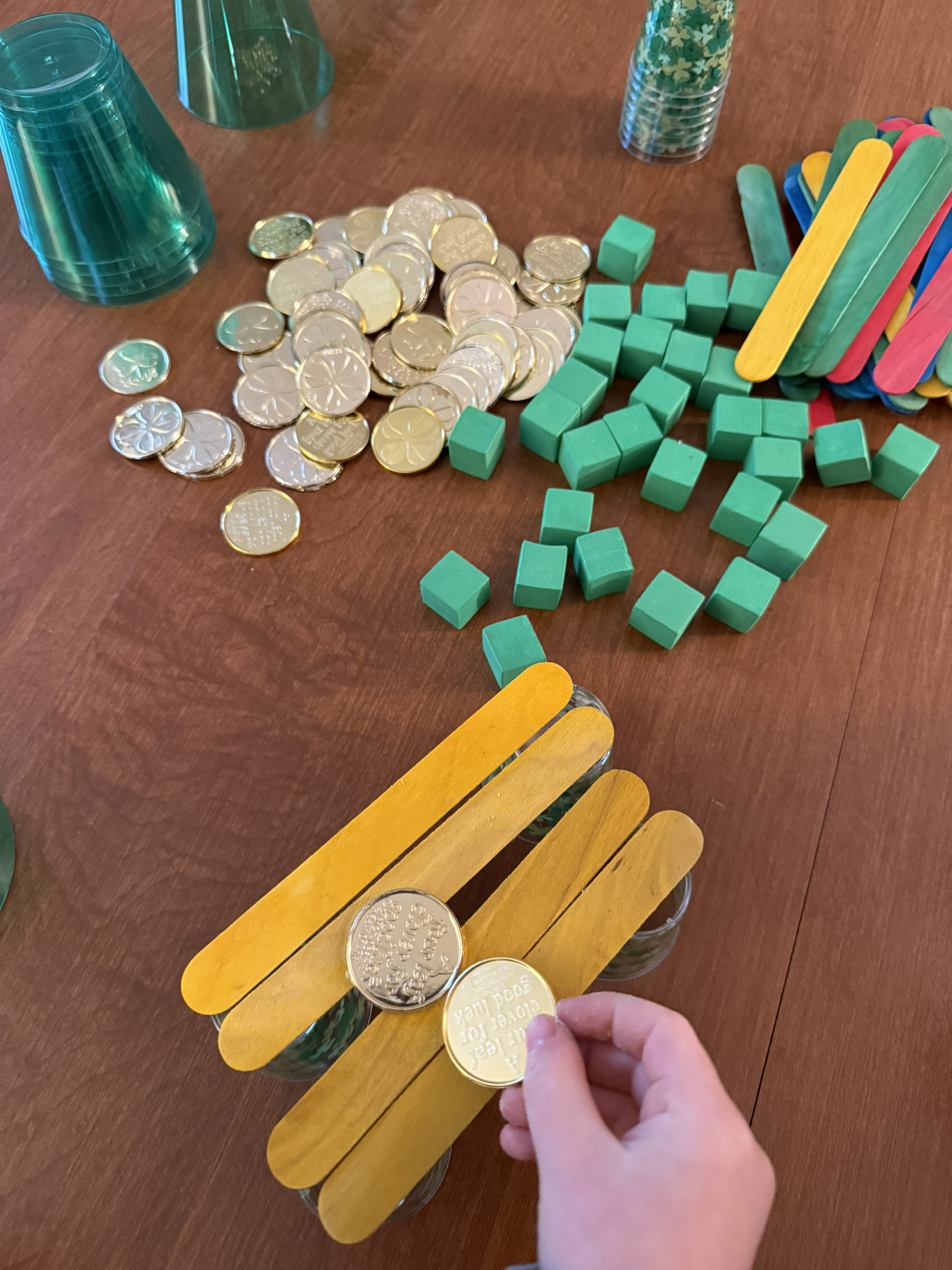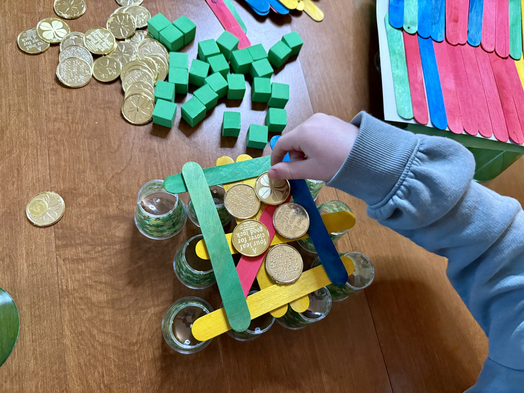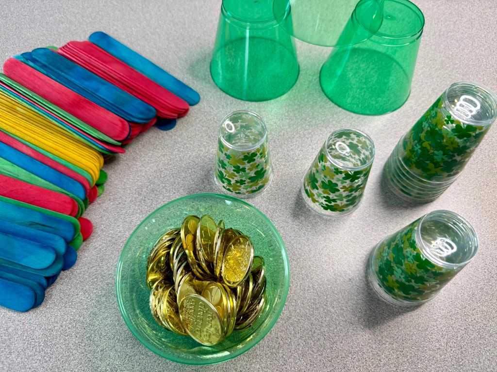 For this activity, I gathered rainbow tongue depressors, gold coins, festive plastic cups and green foam cubes. One easy way to make an activity festive is to use the materials you already have but only pull out the festive colors. So if you have snap cubes or unifix cubes, just grab the green ones! Same with colored blocks, pom poms, etc.