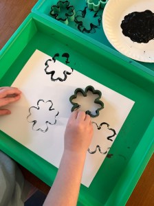 We started this craft by stamping shamrocks all over the page in black paint. We used shamrock shaped pancake molds that we already had on hand. I found these in the Target Dollar Spot last year. And since those items aren’t available anymore, I did take the time to find a set of Shamrock cookie cutters that will work just as well. Just click on the picture below if you’d like to grab them. You can also use bell peppers cut in half for an easy shamrock shape.
