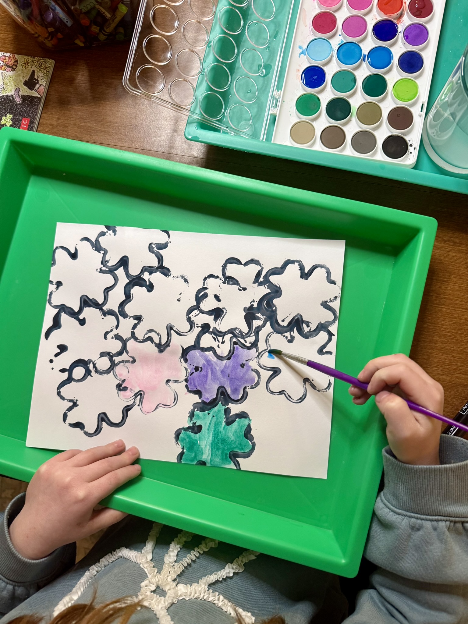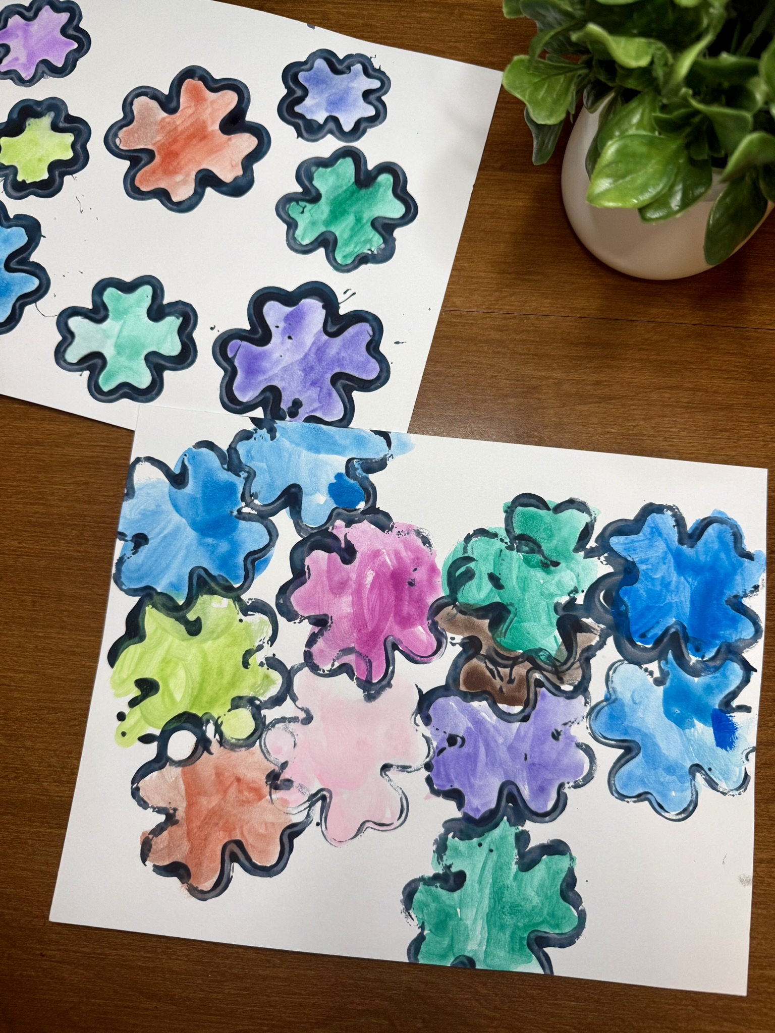 After stamping the shamrock shapes in black paint, we let our papers dry completely. Once dry, we used watercolor paints to fill in each shamrock with different colors. You can choose to stick with festive shades of greens or use all the colors of the rainbow. Either way, the end product will be stunning! My favorite kind of crafts have no two products that look alike. I love how Lillian overlapped her stamps. It added space for so many colors and depth to her final product!