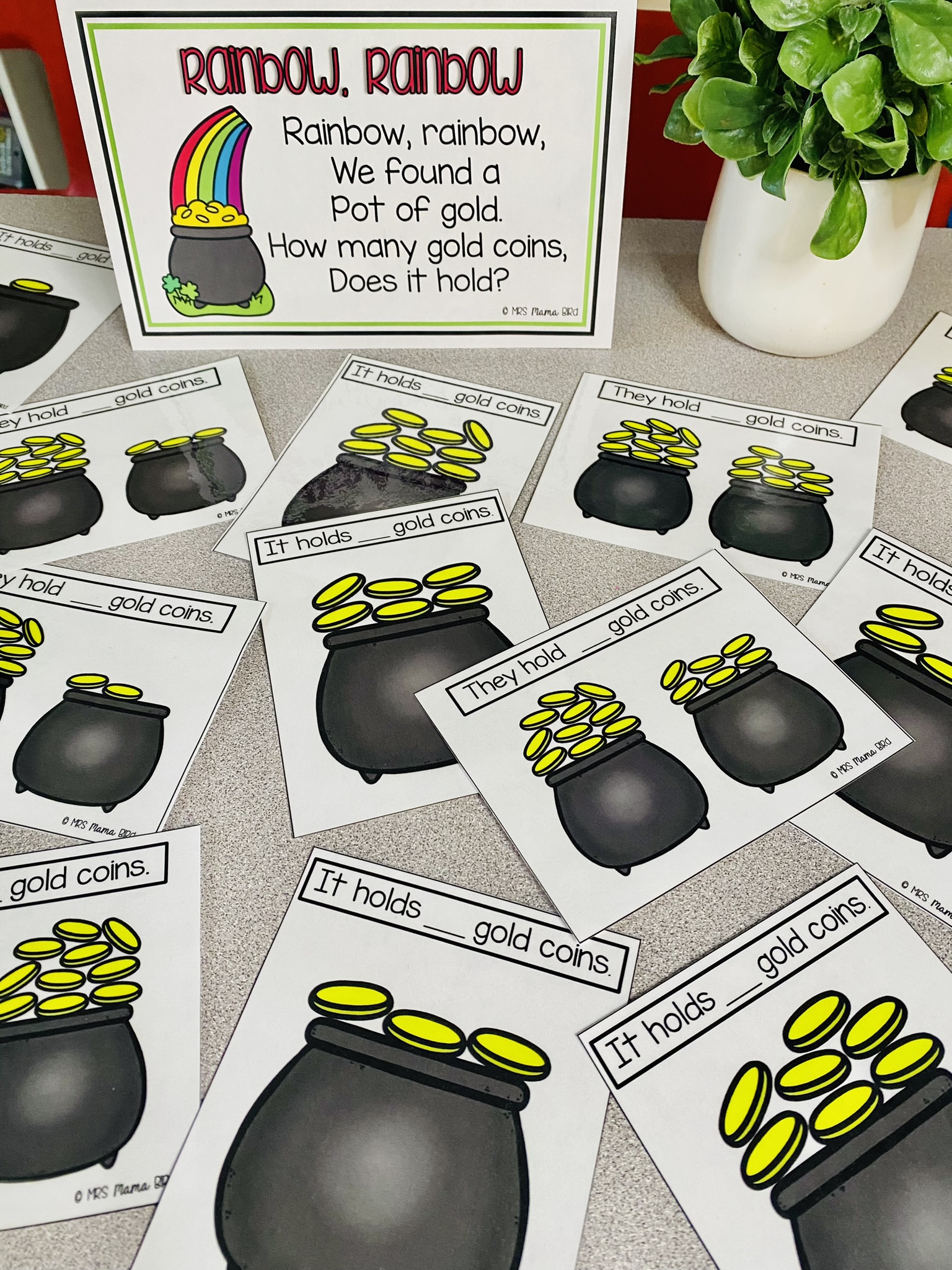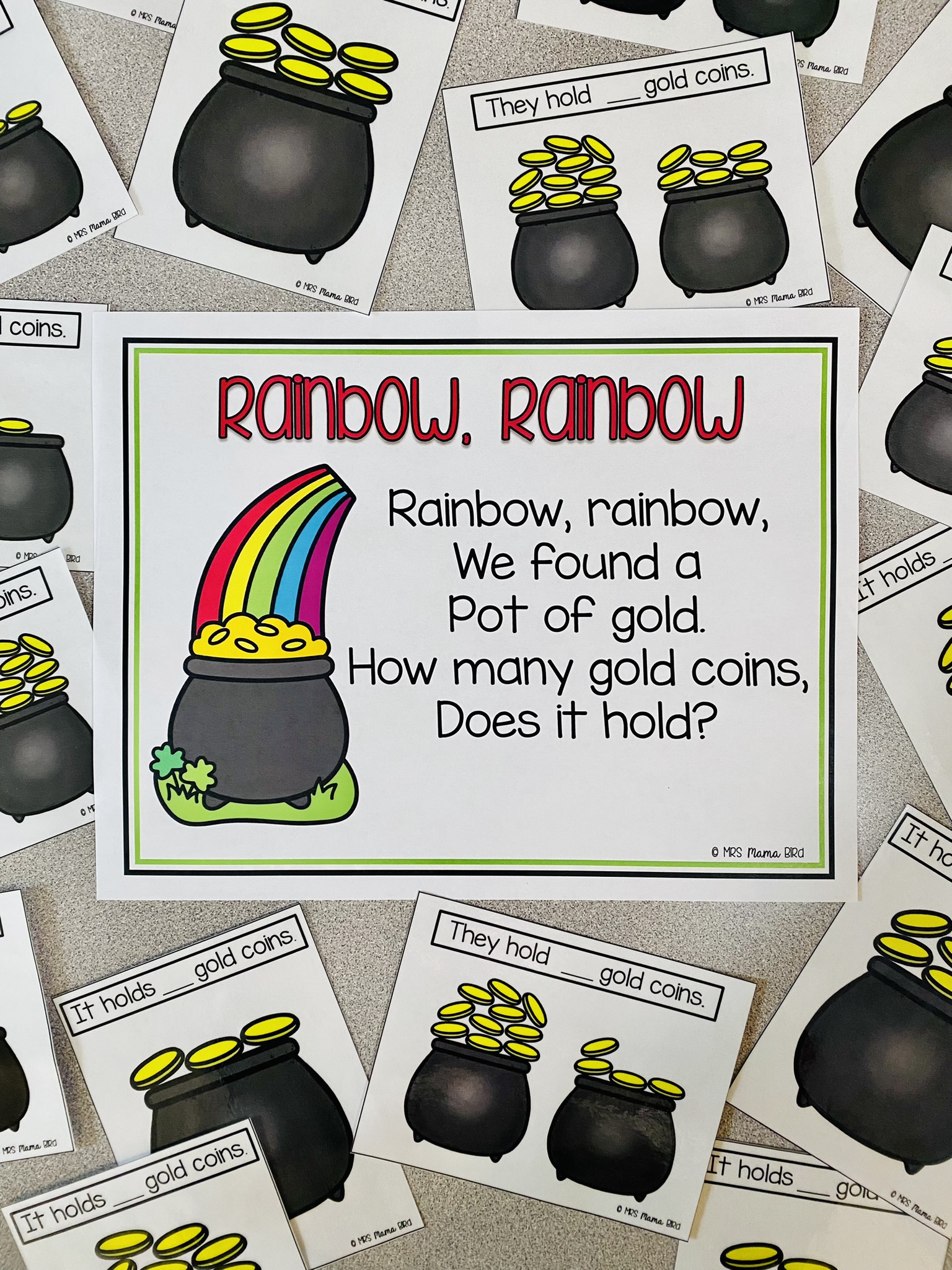 Rainbow, rainbow. We found a pot of gold. How many gold coins does it hold?