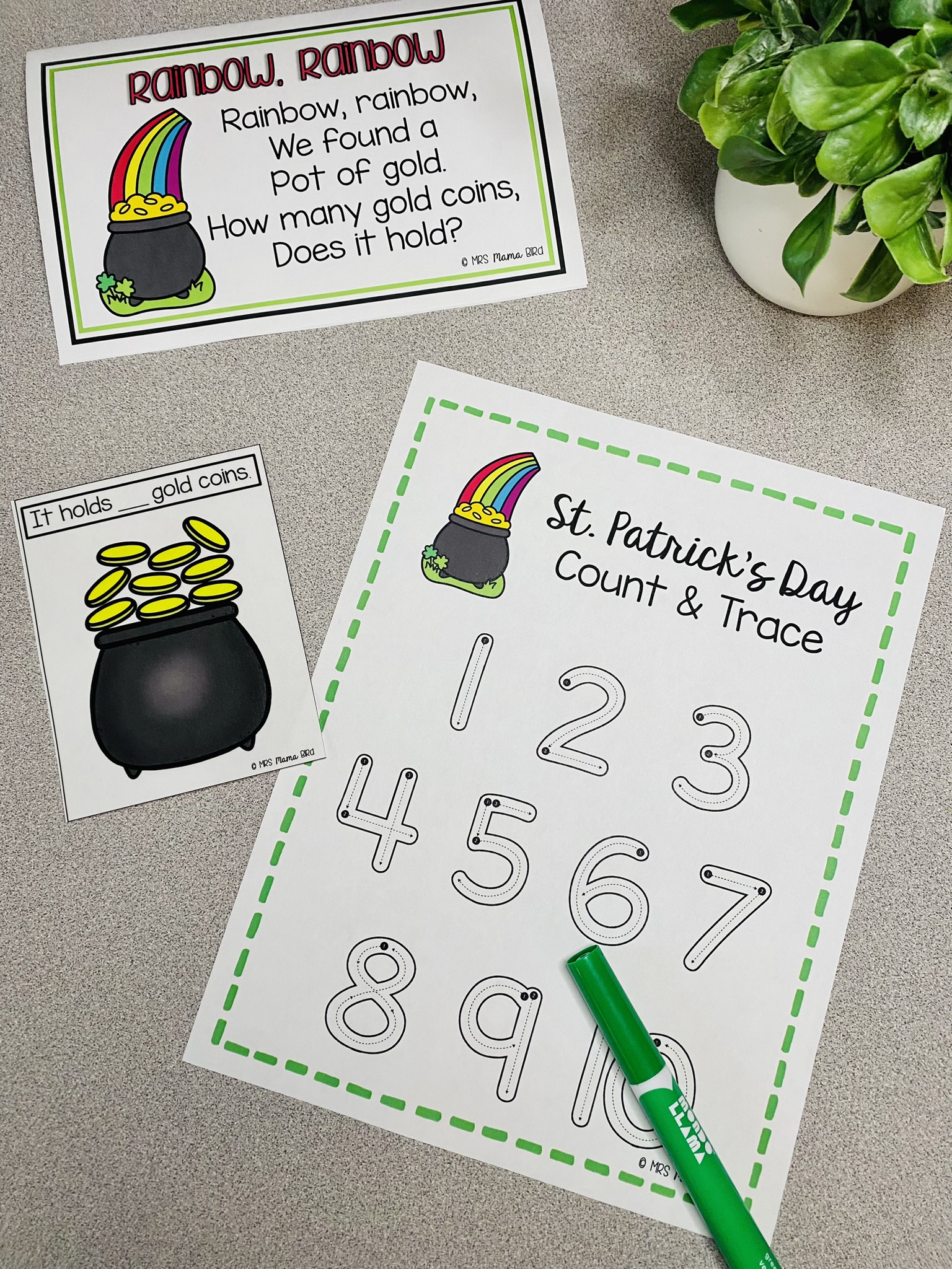 Say the chant with your preschoolers before choosing a pot of gold card. The cards include numbers 1 – 20, but you can pick out the specific numbers you’d like to practice if you don’t want to do that many.