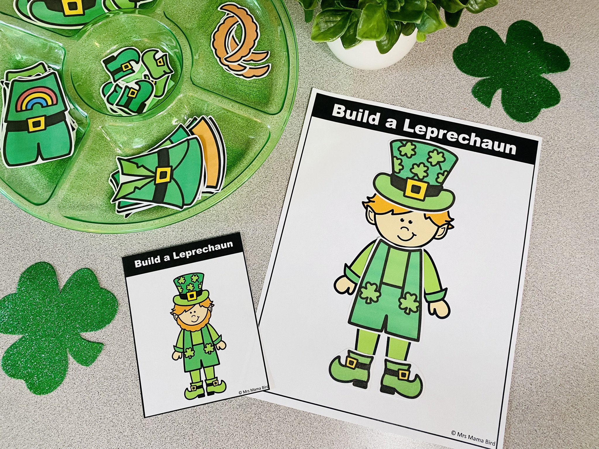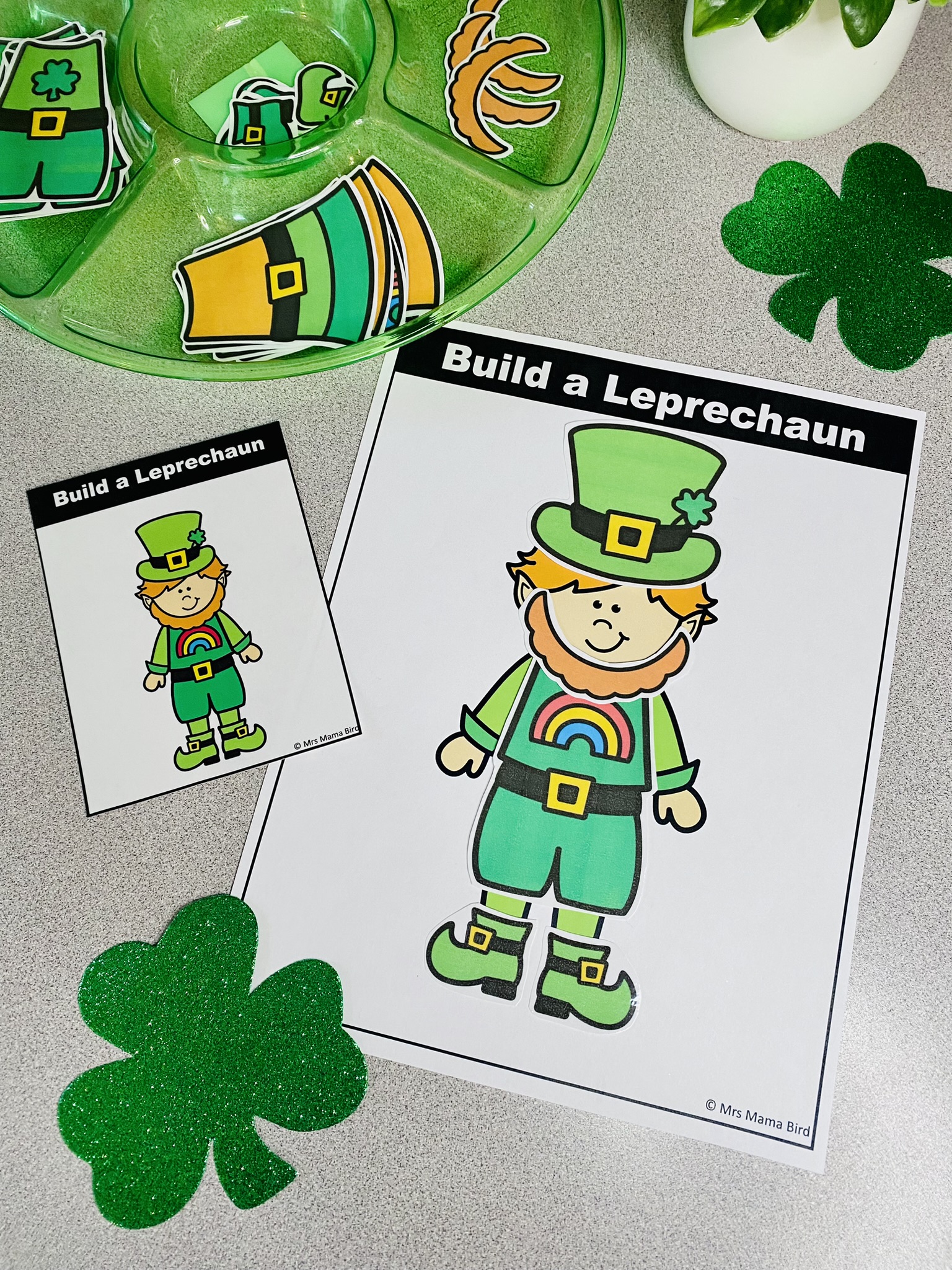 One of my favorite skills to practice with young children is visual discrimination. This Build a Leprechaun Task Card Activity is the perfect way to strengthen both visual discrimination and fine motor skills. In order to set this one up, place the Build a Leprechaun mats (boy or girl mats to choose from) in front of your preschoolers. Provide the leprechaun cut outs in reach – hats, beards, shirts, pants, and shoes. Have your preschooler pick a card and use the pieces to recreate the same leprechaun. Challenge them to build several different ones. If they make a mistake, you can guide them to self correct by saying, “Let’s make sure this matches.” or “Let’s check this.” You can also make this an open ended activity by allowing them to use the pieces to make their own leprechauns. They will have so much fun with this one!!