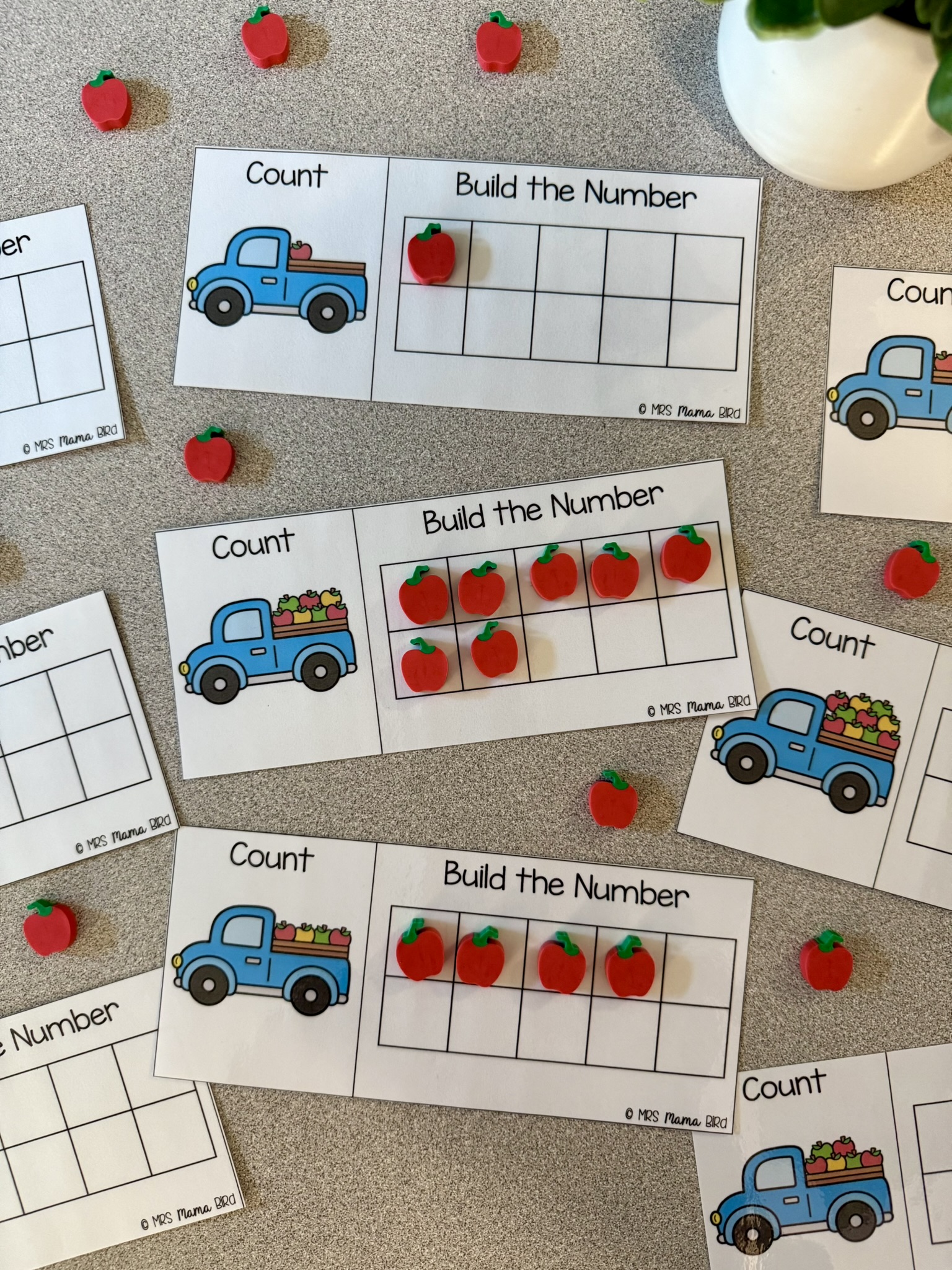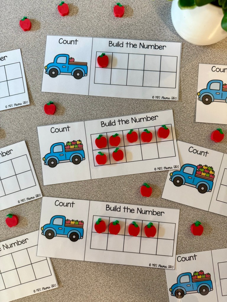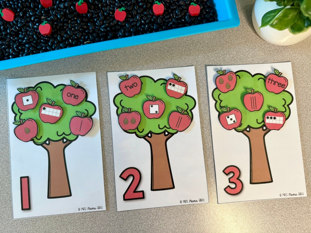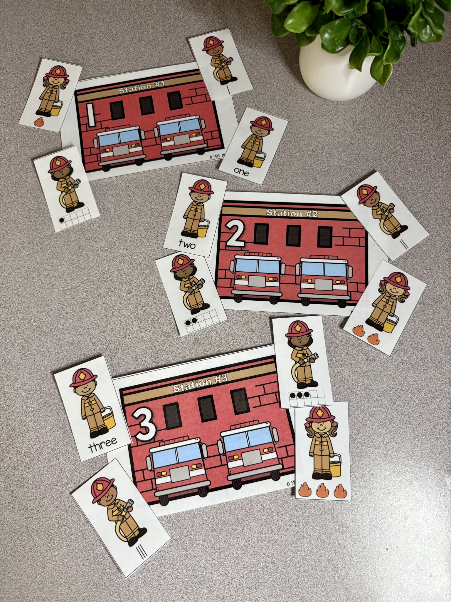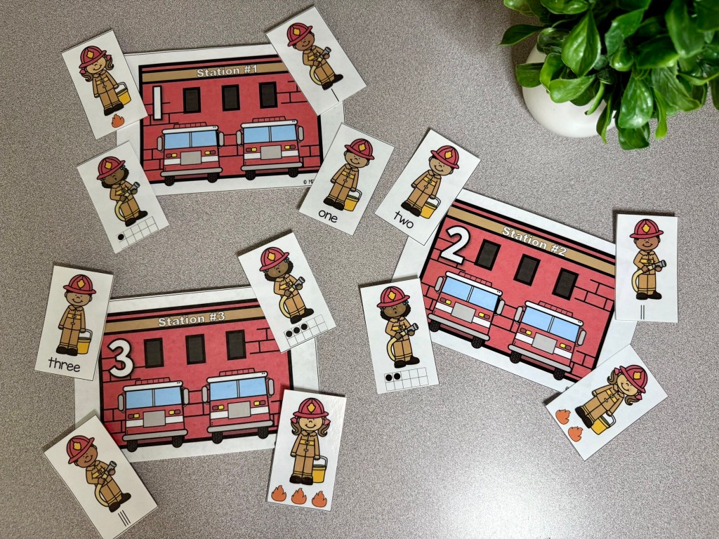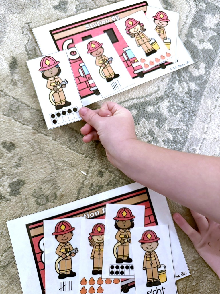 This number sort is the first activity my 5 year old daughter pulled of the shelf when I set out this Teaching Tote. She loved practicing recognizing the numbers in different forms and helping all the firefighters find their correct stations.