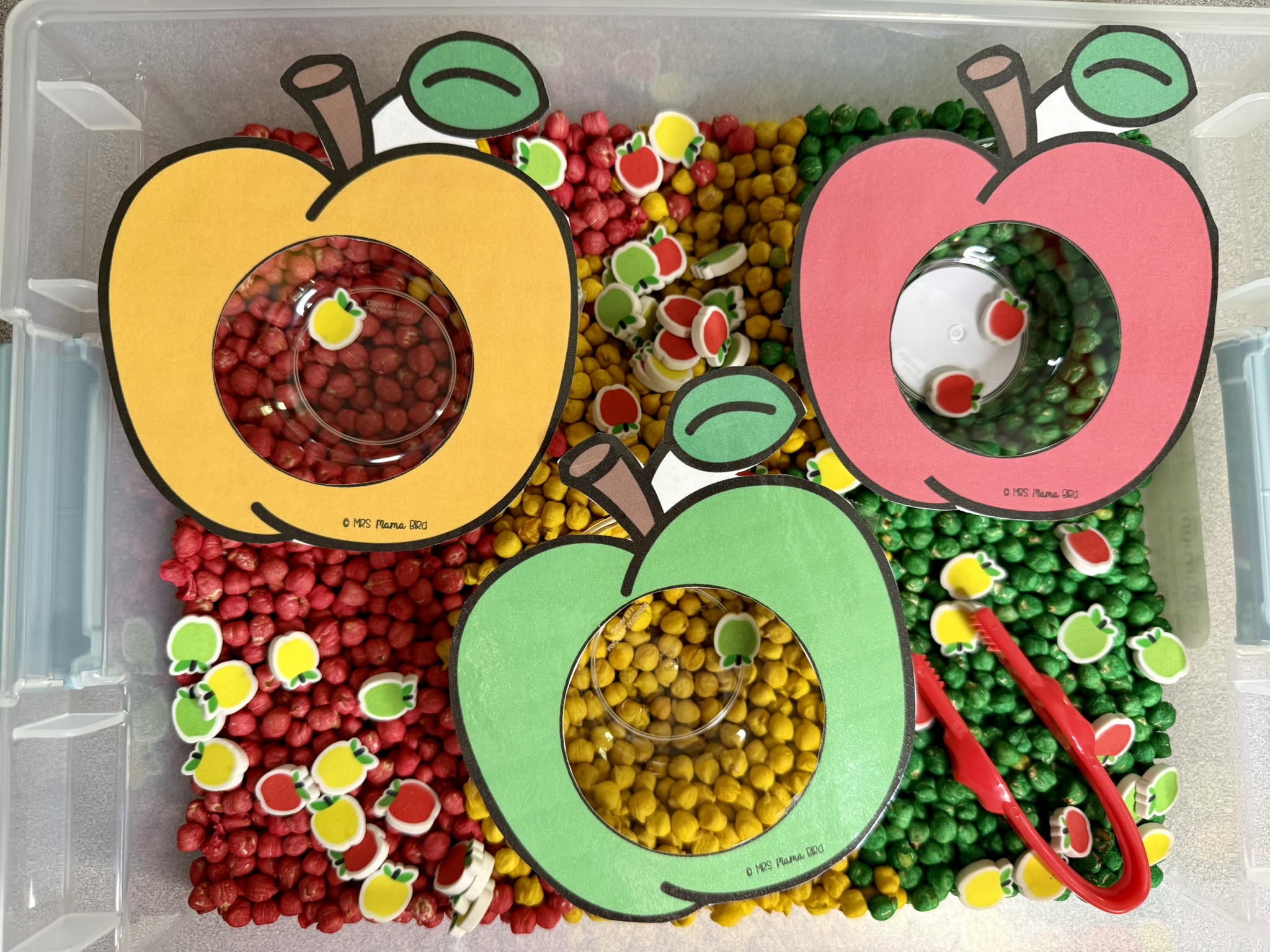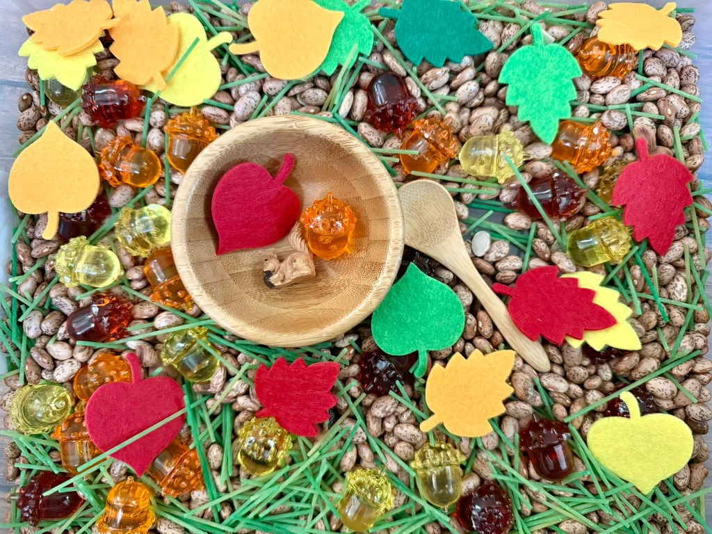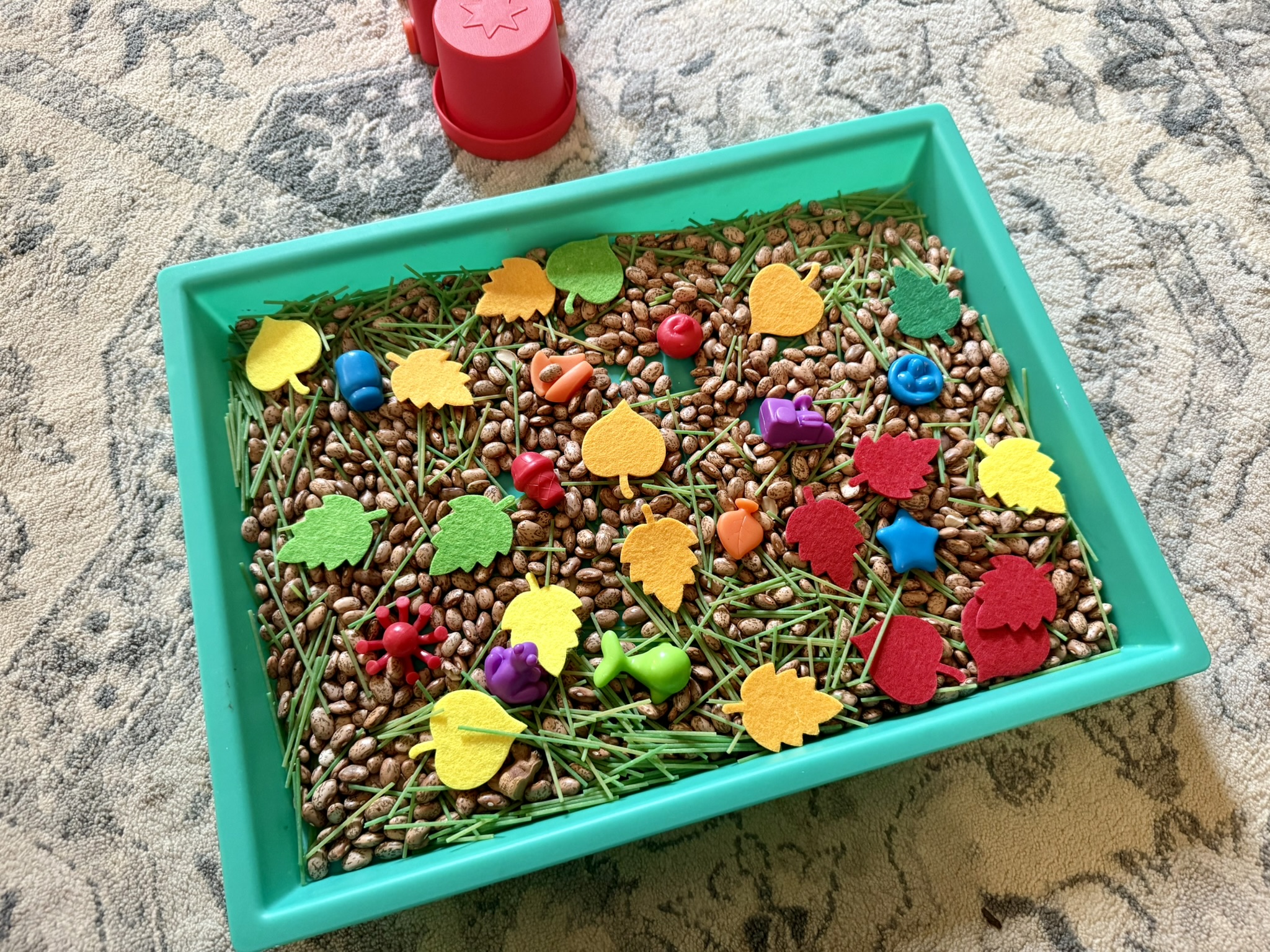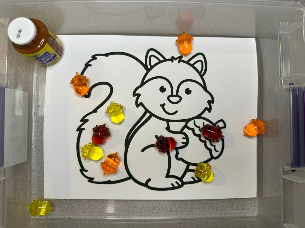 One of my favorite things to curate and put together for Teaching Totes are the themed sensory bins. This Fire Safety Teaching Tote contains a sensory bin with a picture match activity. The sensory bin is full of black beans and orange acrylic table scatter (fire!). It also is hiding several fire safety pictures in the bin- firetrucks, firefighters, axes, cones, fire hydrants, fire alarms, boots, fire extinguishers and ladders. You child can sift through the sensory bin, find the pictures and match them to the picture match mat. This is a fun way to practice visual discrimination skills, fine motor skills, and fire safety vocabulary. Click the picture for more information!