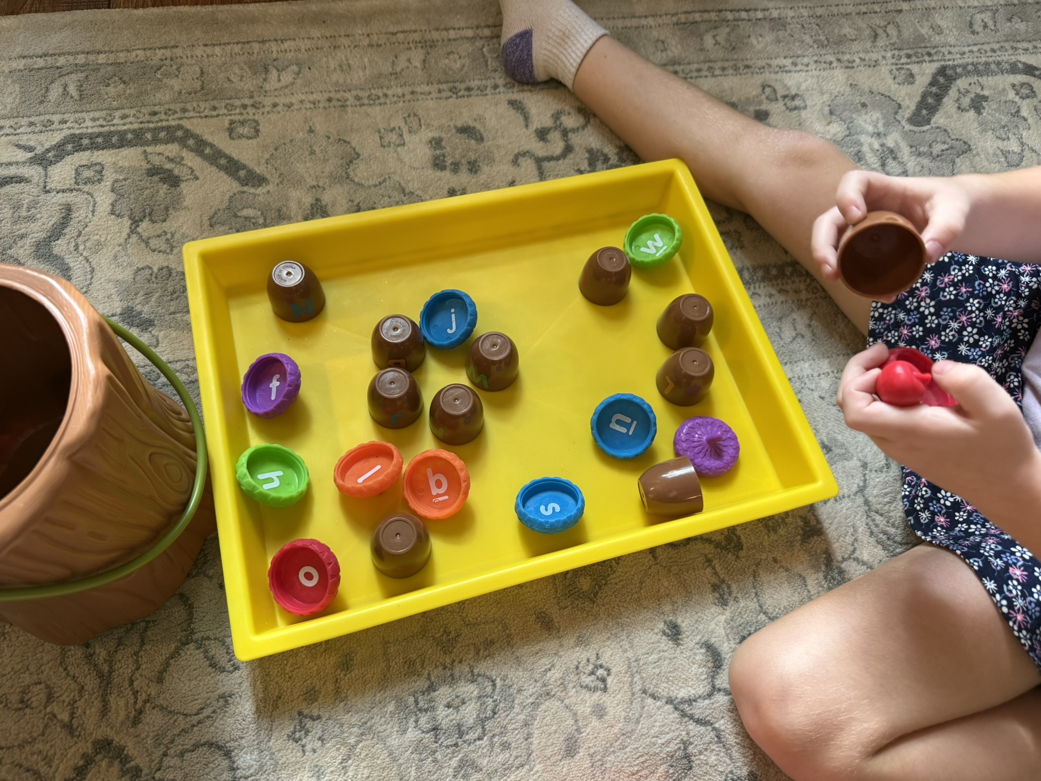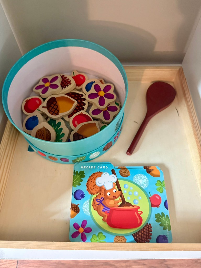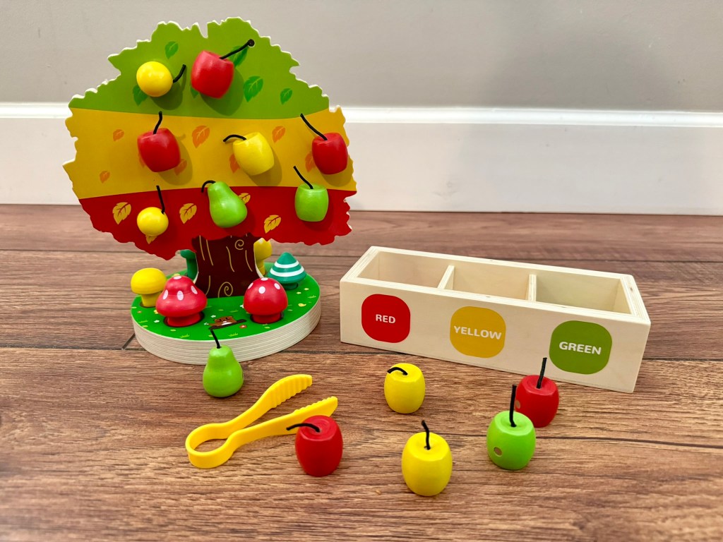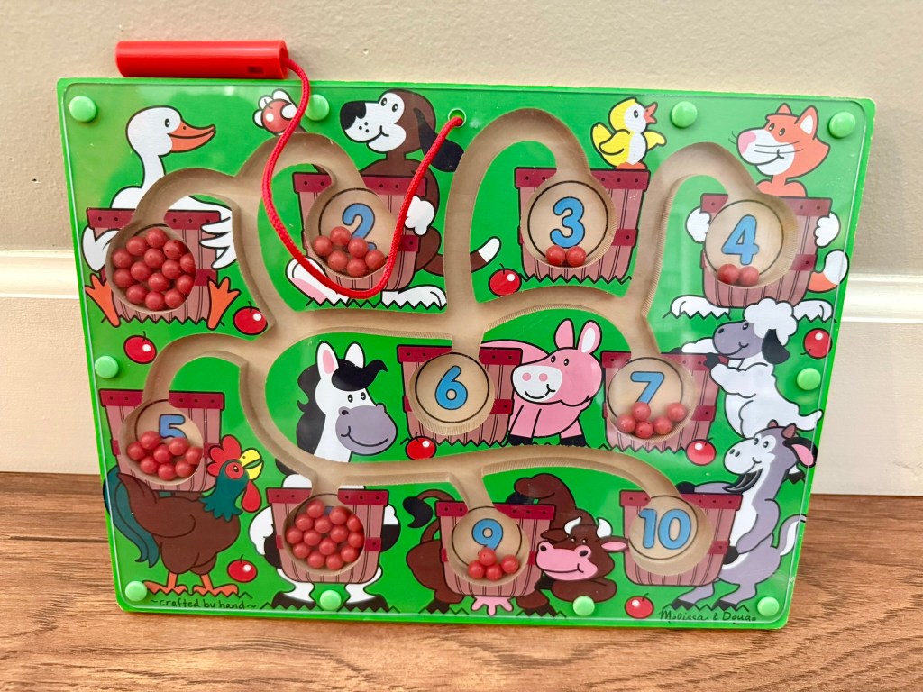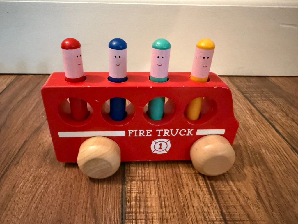I do want to take a moment to highlight this wooden Pop Up Firetruck. This toy was a gift from my sister in law, who is a Montessori teacher and always introduces me to the best toys. Each little firefighter peg has a spring underneath so that when your child pushes down, it will spring up and pop out. My littles LOVE this toy and find it incredibly entertaining. It is designed for toddles, but I included it in this preschool tote because my kids honestly still love to fiddle with it. Click the picture for more details!