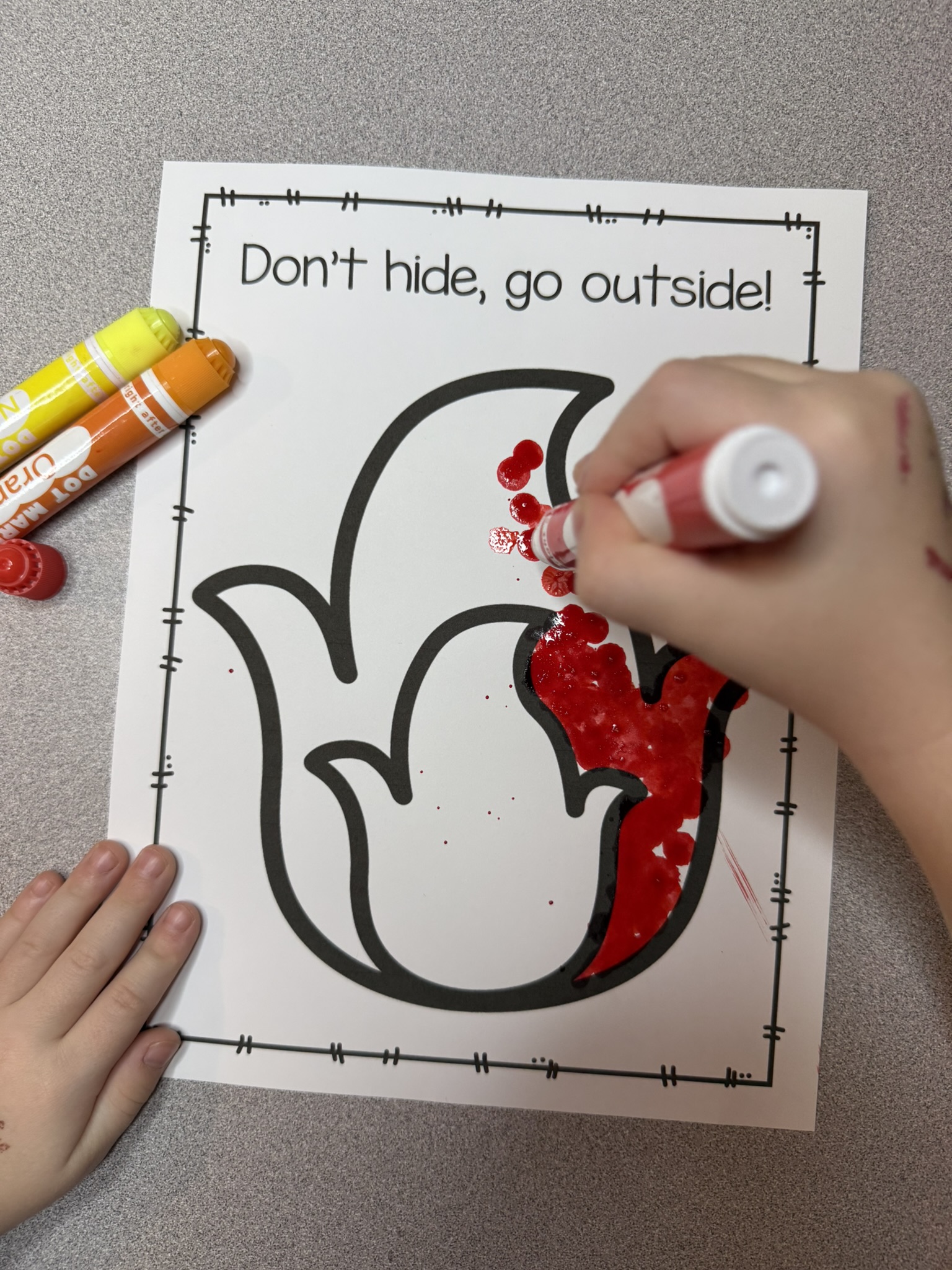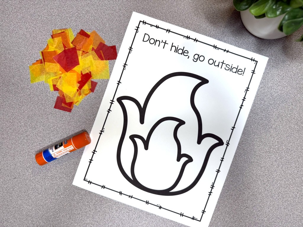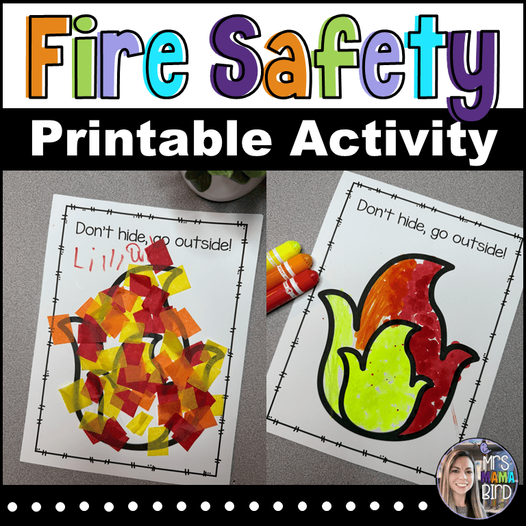 Of course we need to talk about the FREE Fire Safety printable craft template that I’ve included in the Teaching Tote. One of the most important things I teach preschoolers is not to be afraid of the firefighters that come help us. It is important to show them that firefighters wear masks that cover their faces and that might look scary. But firefighters are the same friendly helpers under all their gear and it is important never to hide from them in an emergency. Here is an easy prep printable to help reiterate that important safety tip with your preschooler. The “Don’t hide, go outside!” can be colored however your preschoolers(or you) choose- with tissue paper, dot markers, dot stickers, markers, paint, etc. You can grab this printable for free by clicking the picture below.