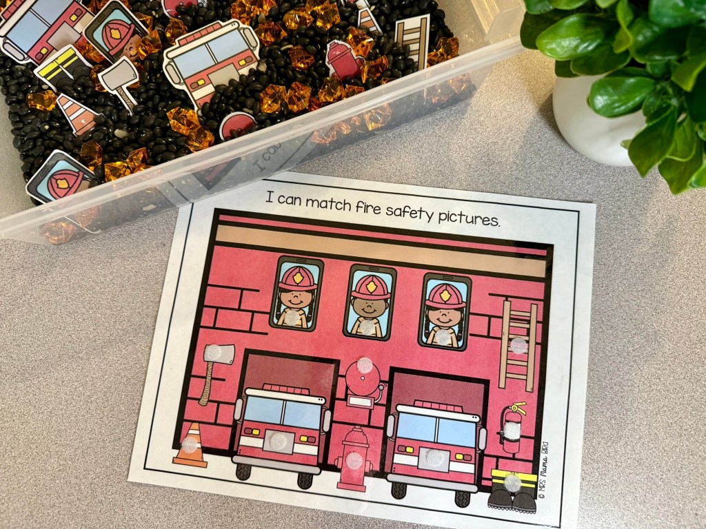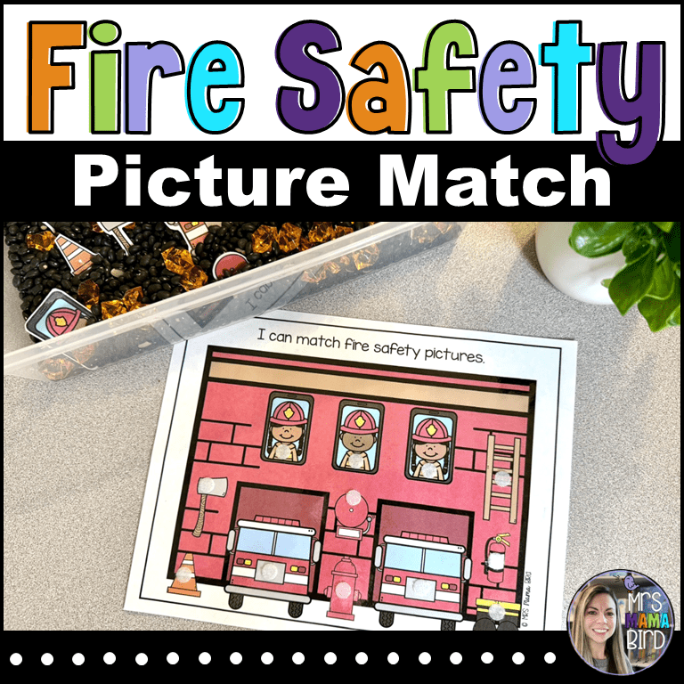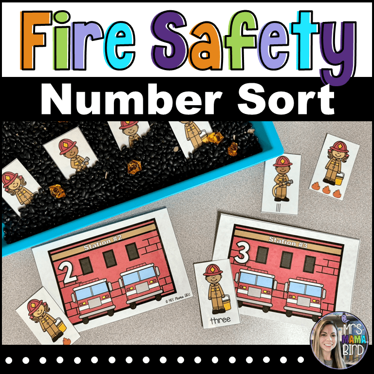 Another activity included in the Fire Safety Teaching Tote is the Firefighter Number Sort. This activity includes Fire Stations 1 – 20 and four firefighter cards for each station. The firefighter cards represent numbers 1 – 20 in four forms, words, tallies, tens frames, and quantities. You can decide what numbers you’d like to practice with your child and gather the corresponding firefighter cards. Then have your child place each firefighter in the fire station where they belong. Take turns together and see how many numbers you can practice! If you need more information on this activity, click the picture.