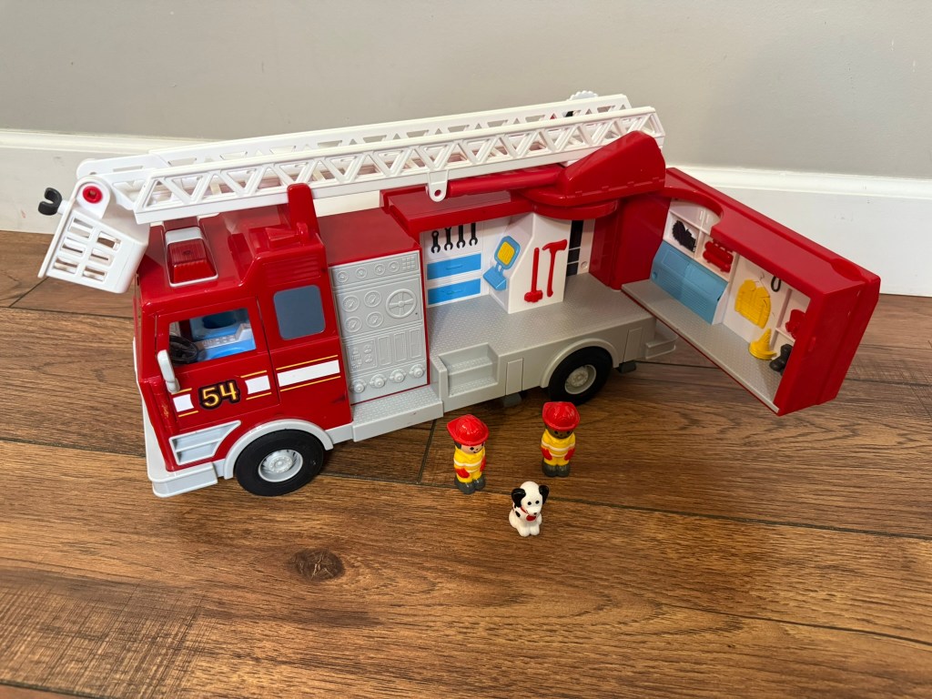 One of my favorite playsets is this firetruck by Lakeshore Learning. It is a heavy duty firetruck with a retractable ladder, opening compartment, 2 firefighter figures and a fire dog. My 5 year old absolutely loves playsets with little figures that can sit inside or on top off things. This is a fun way to spark imagination with it comes to fire safety!