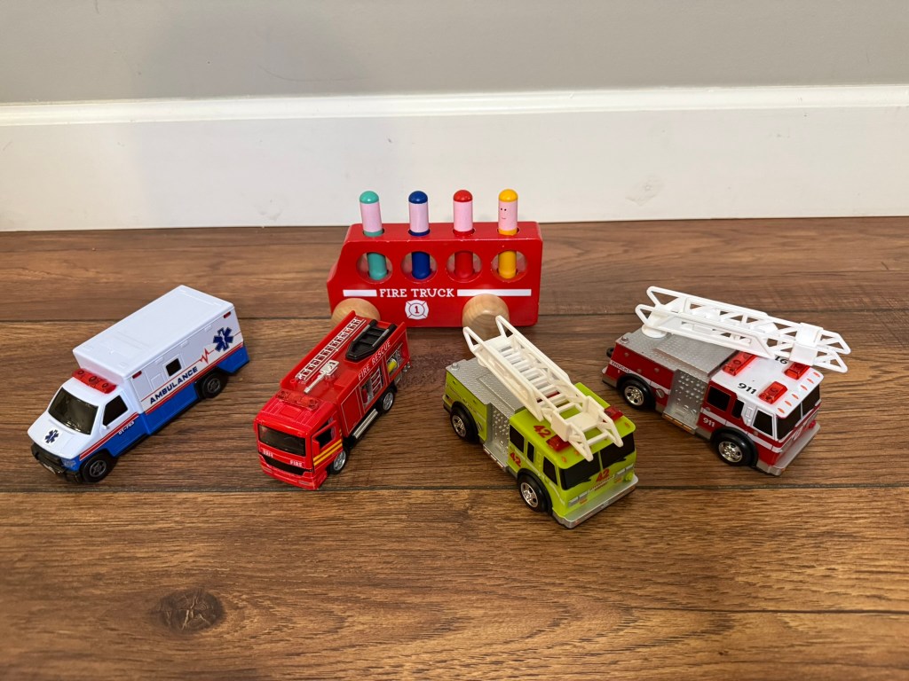 Emergency vehicles!! No Fire Safety Teaching Tote or toy rotation would be complete without all the vehicles! These little firetrucks and ambulances are perfect for anyone who loves toys with wheels. You can also use these to introduce your child to the elements of an emergency vehicle (siren, ladder, pump panel, etc.). I am super thrifty so I gathered these over time from yard sales and consignment sales. But for those of you who are short on time, I will include a link to a similar set on Amazon that reviews very well. Click the picture to see!
