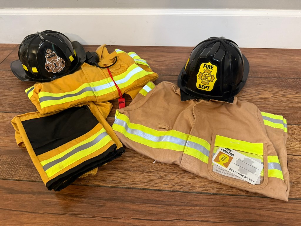 Dress up is the ultimate way to let your preschoolers immerse themselves in a world of imagination. This Fire Safety Teaching Tote includes two firefighter coats, 1 pair of fire pants, and two helmets. One of these sets was purchased from Costco years ago, so if it is Halloween season as you are reading this, you might have some luck finding your own there! The other set is from Melissa & Doug, however they’ve since changed the color of the jackets. If you’d like to add the current version of this costume to your playroom, click on the picture for the link.