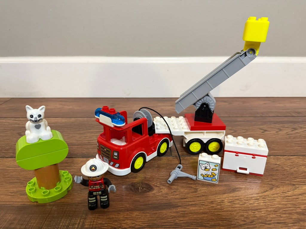 Another toy that I’ve included in the Fire Safety Teaching Tote is this fun Lego Duplo Town Fire Truck Set. Preschoolers love the versatility of building and rebuilding the pieces. And every toy firefighter needs their chance to rescue a kitten from a tree! My 5 year old, even though she’s on the upper end of the recommended age, still loves it when I pull this one out. Click the picture if you’d like to add this set to your playroom.