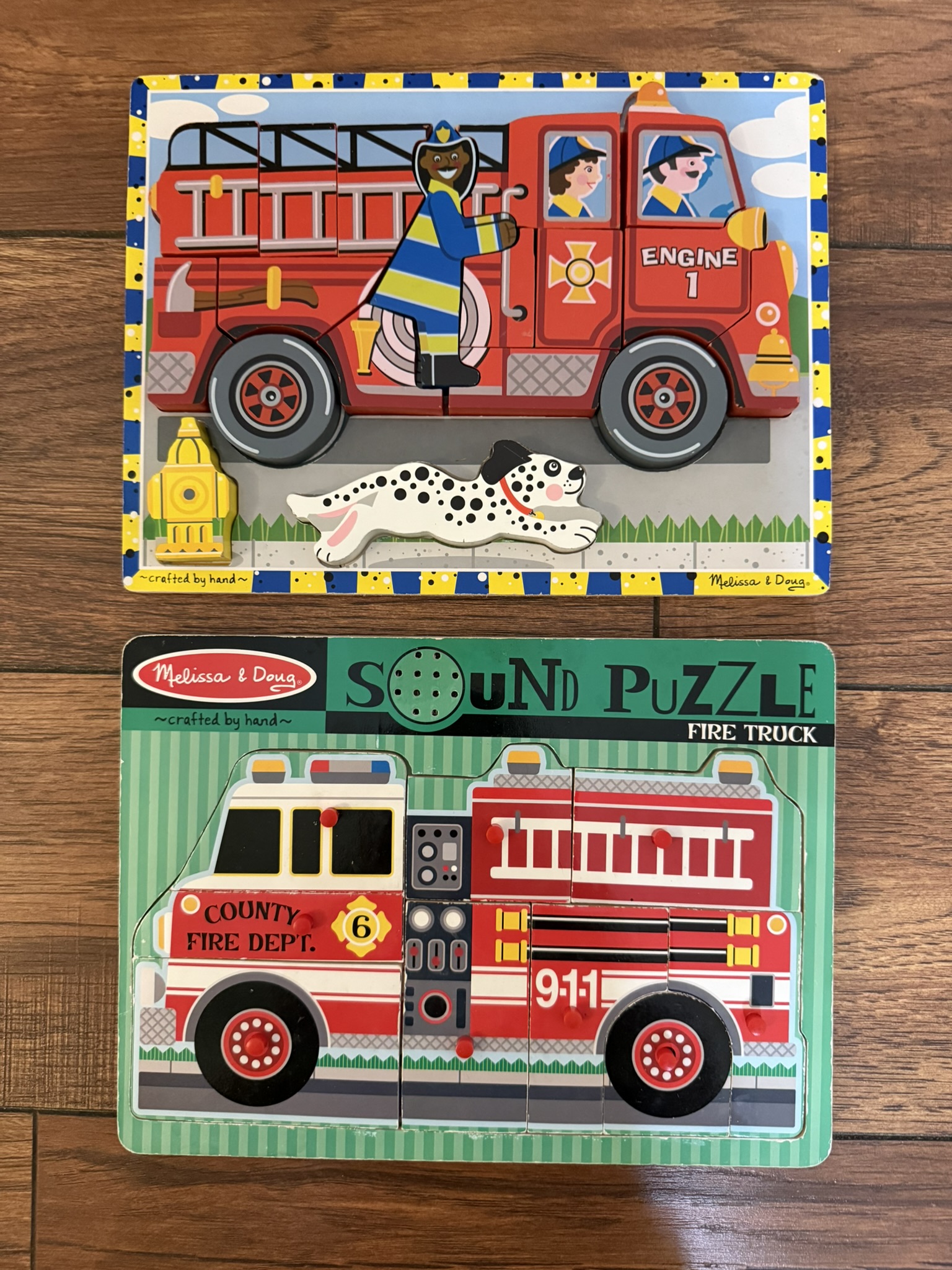 In the fire safety Teaching Tote I gathered three Melissa and Doug firetruck puzzles. I love this collection because even though they are all firetrucks, they each require a little bit different skills to complete. The Melissa & Doug Chunky Firetruck Puzzle is perfect for preschoolers who need larger pieces to grip. The Melissa & Doug Firetruck Sound Puzzle has smaller pegs to master those fine motor skills.