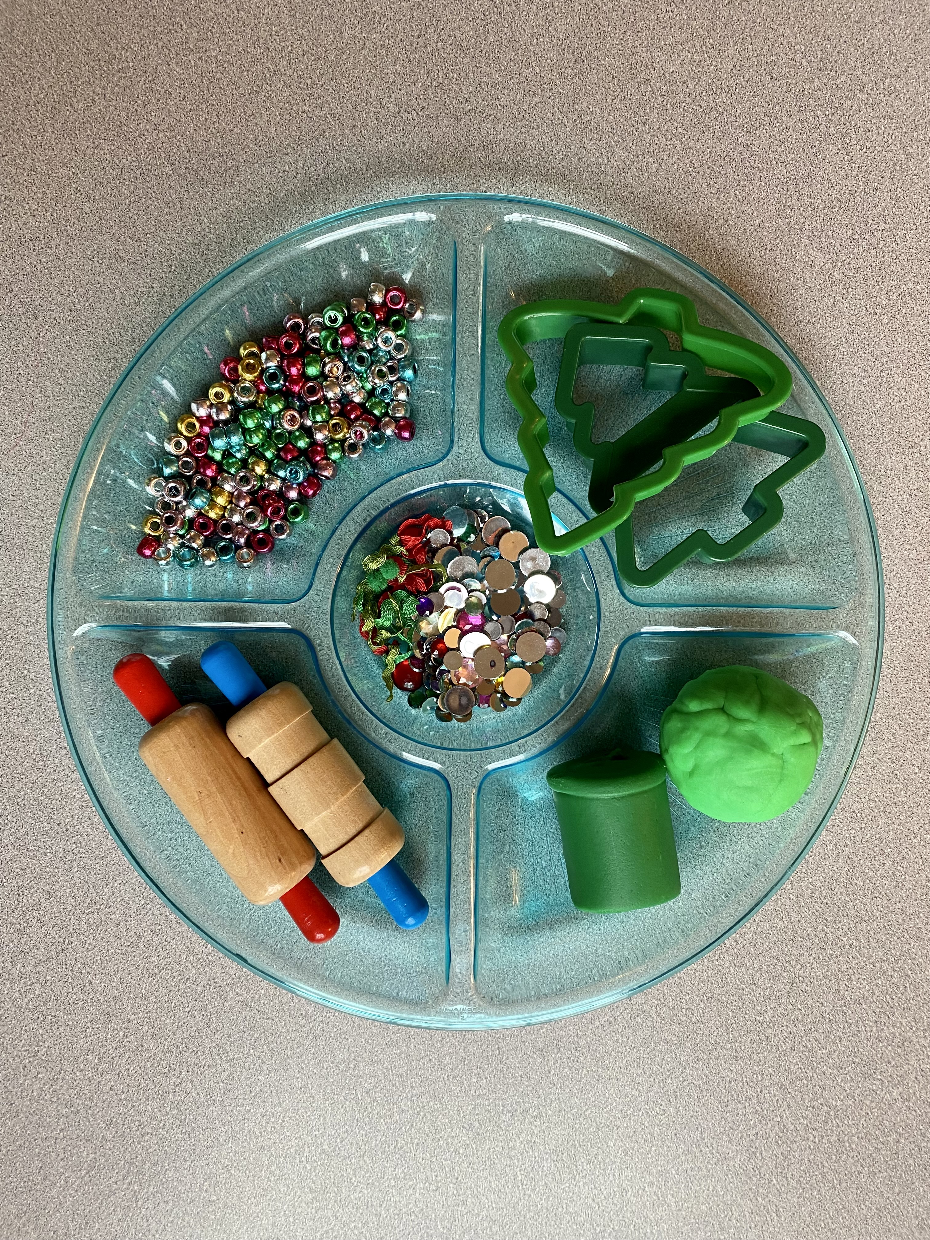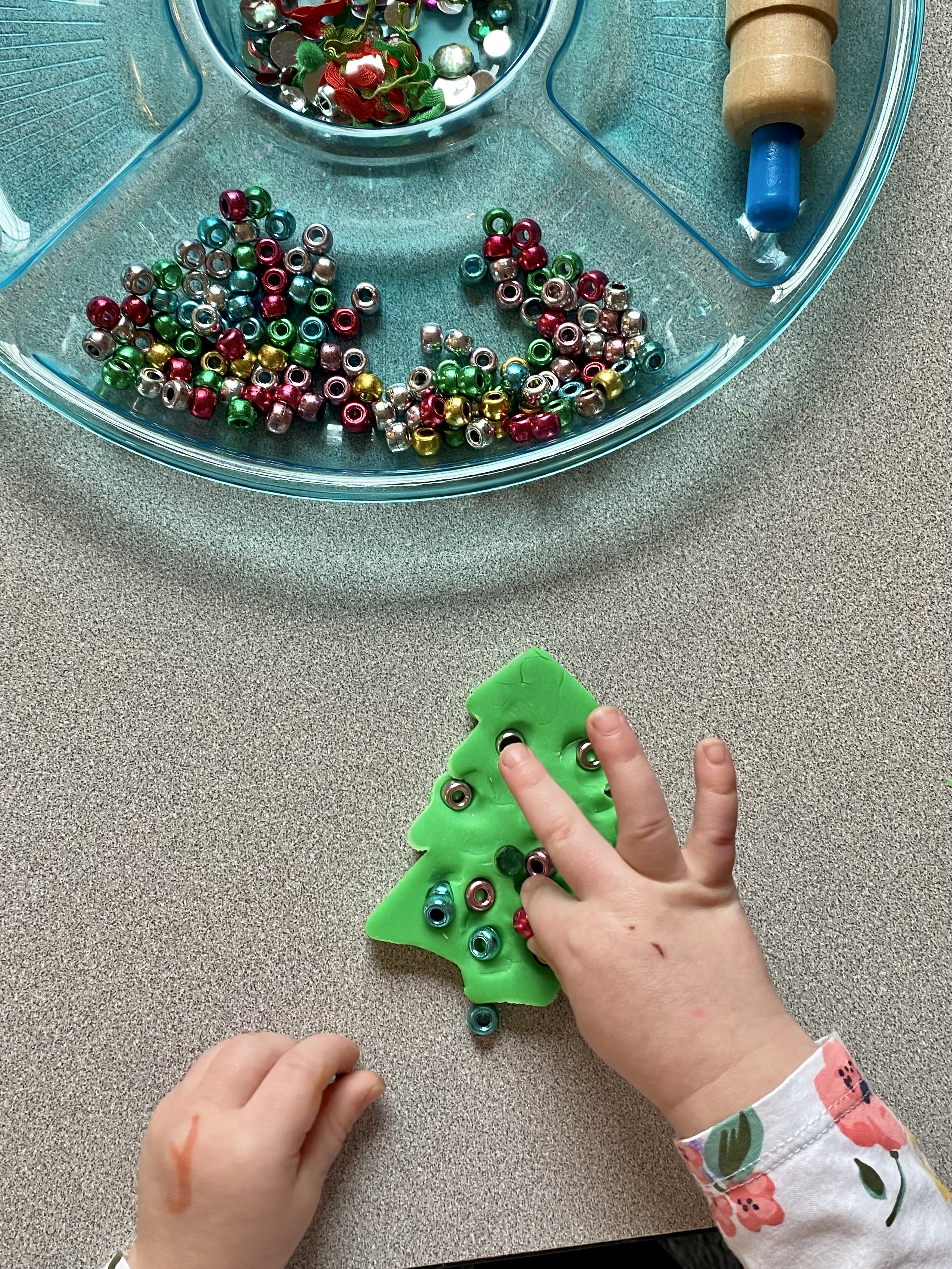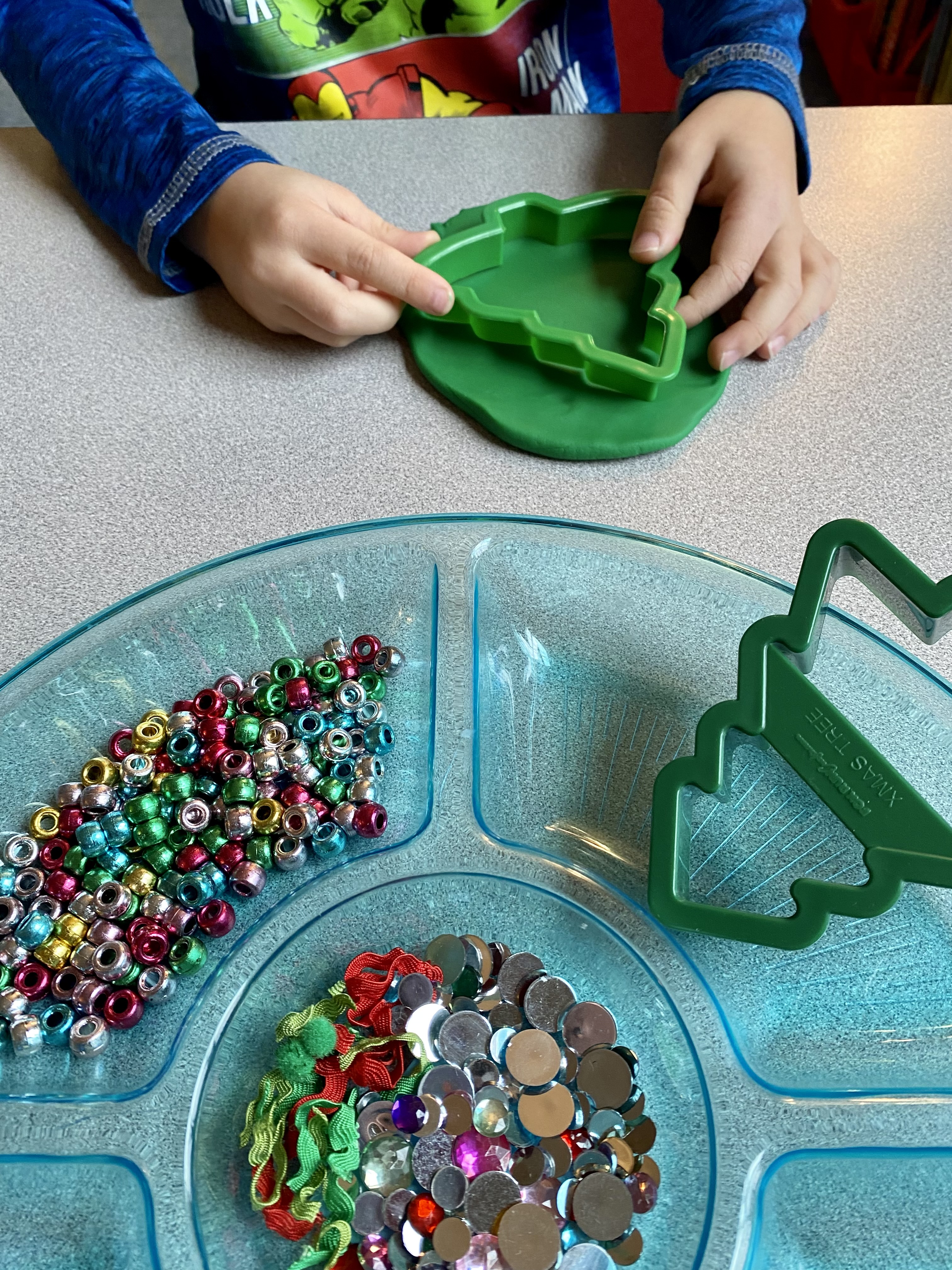 Emmett and Lillian, my preschoolers, flocked right to the Play-Doh tray! (Can I just say how much I love these chip and dip dishes from the Dollar Tree??) I set up the divided tray as an invitation to create a Christmas tree. I included pony beads, plastic gems, and festive fabric trim. Emmett asked for stars, which I wasn’t able to include, but will keep an eye out for them for next time.