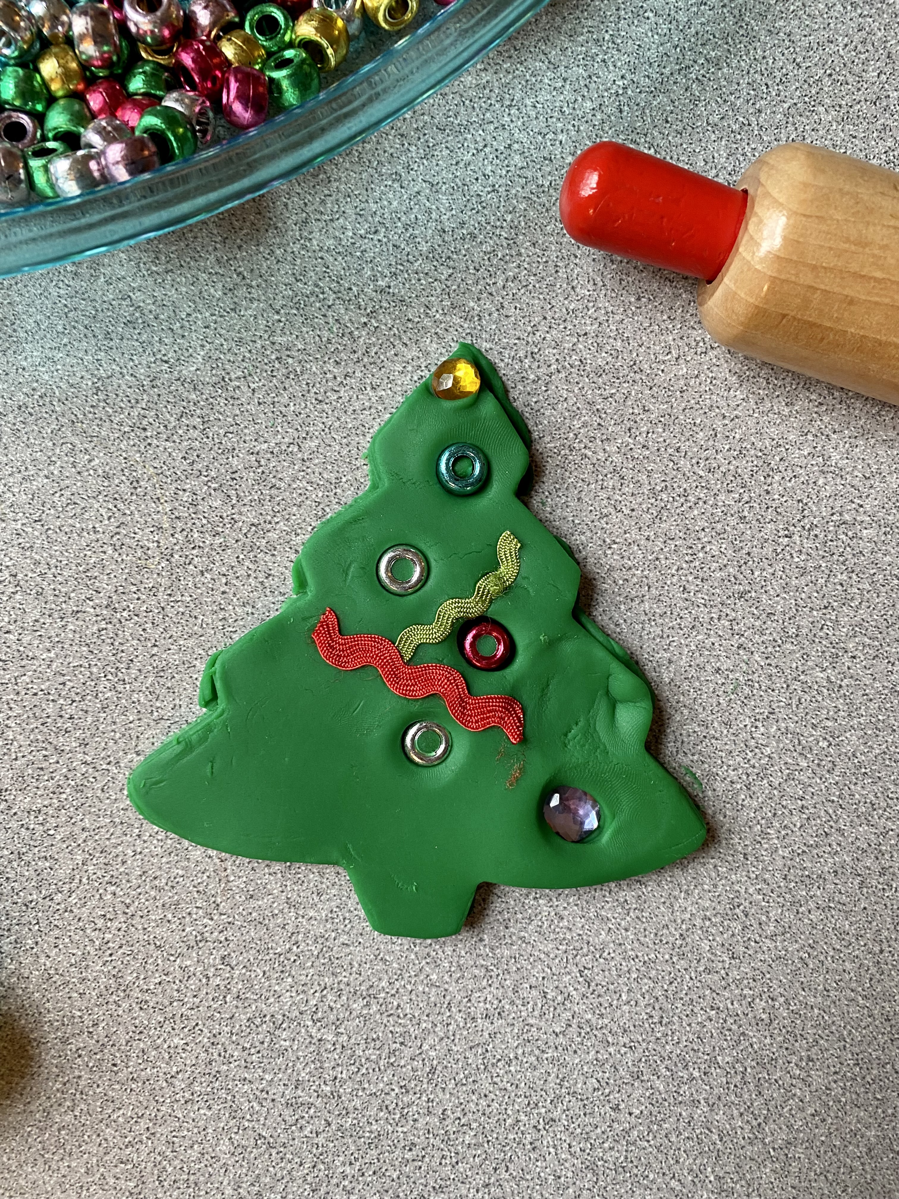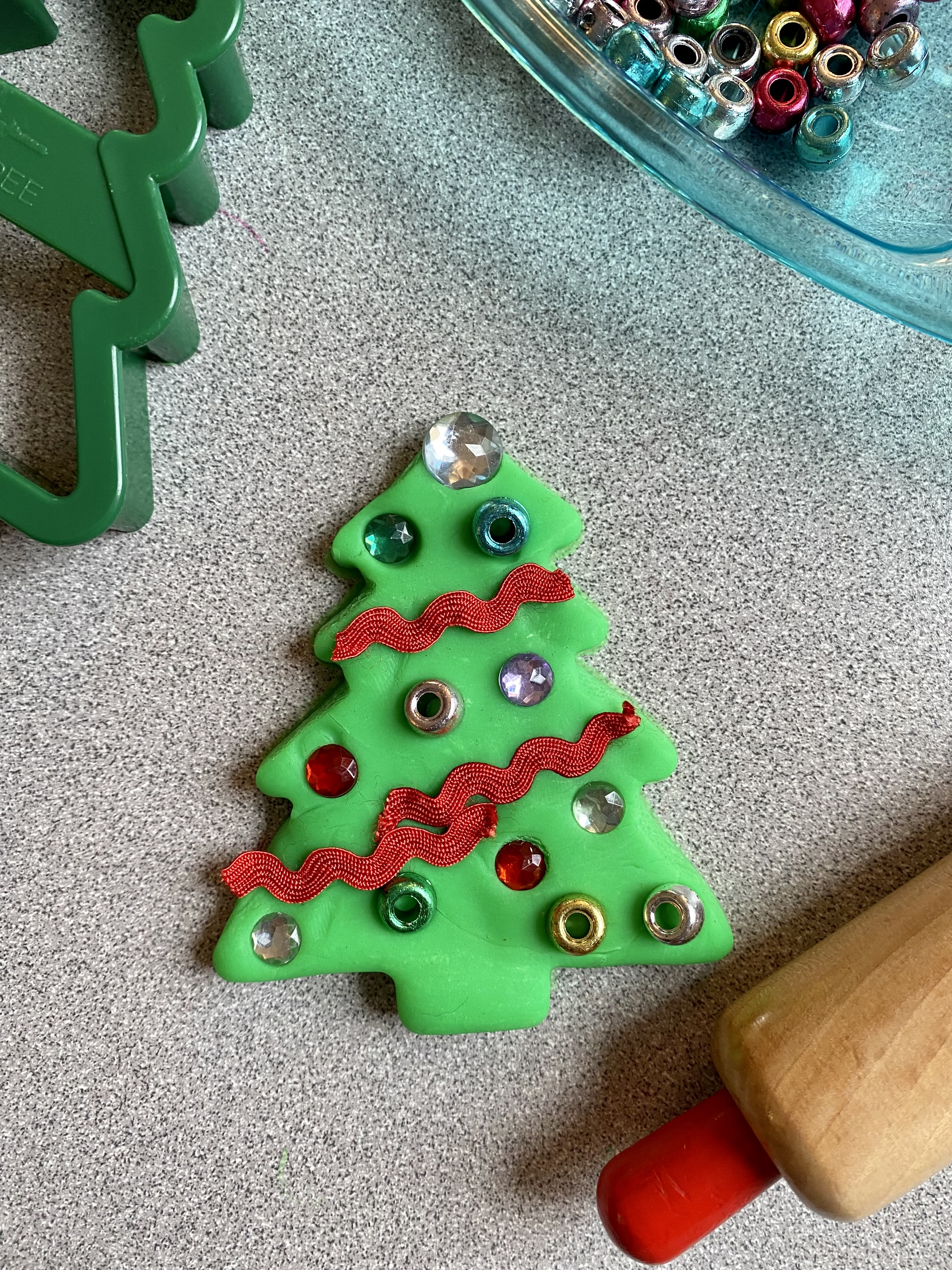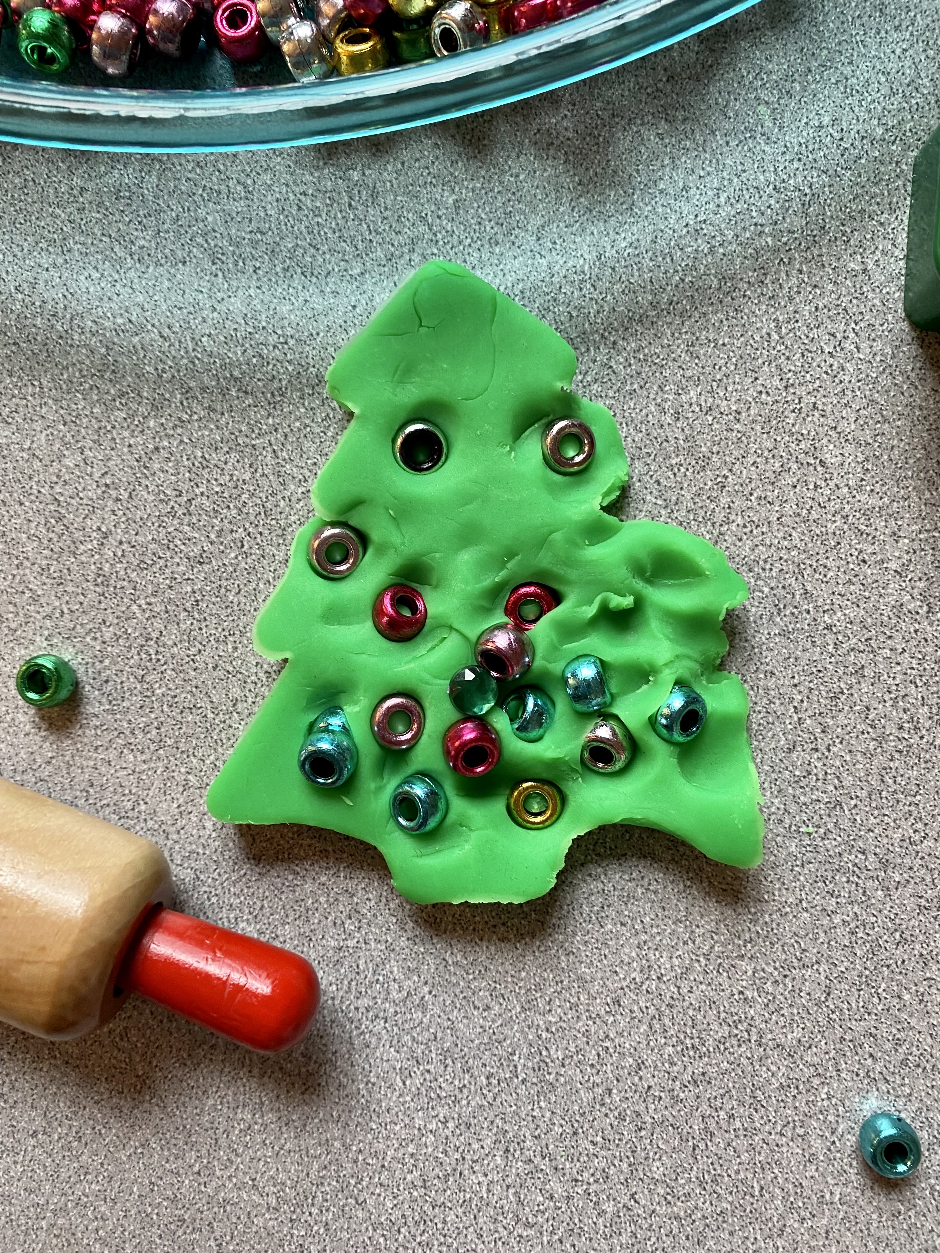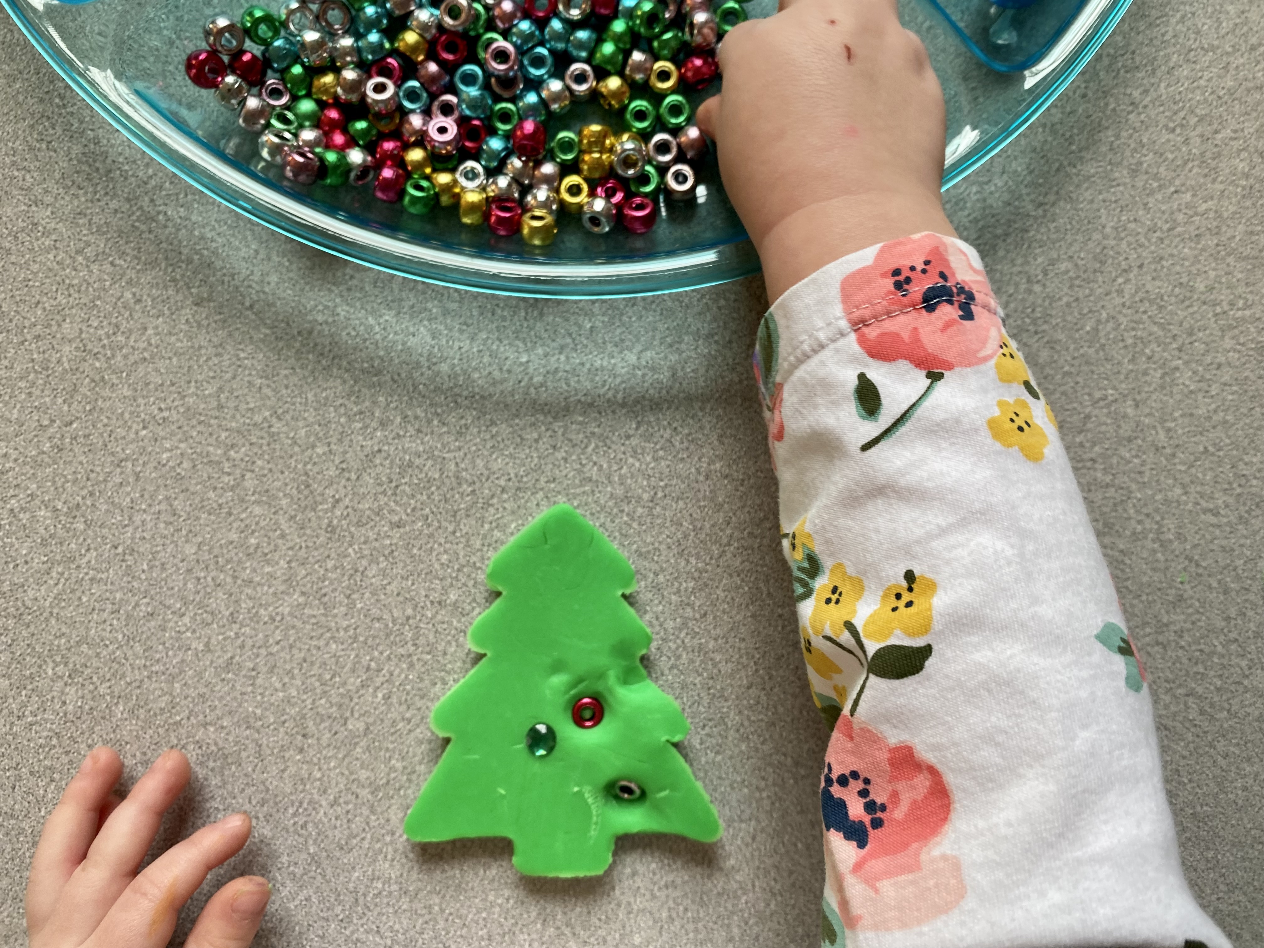 Emmett and Lillian, my preschoolers, flocked right to the Play-Doh tray! (Can I just say how much I love these chip and dip dishes from the Dollar Tree??) I set up the divided tray as an invitation to create a Christmas tree. I included pony beads, plastic gems, and festive fabric trim. Emmett asked for stars, which I wasn’t able to include, but will keep an eye out for them for next time.