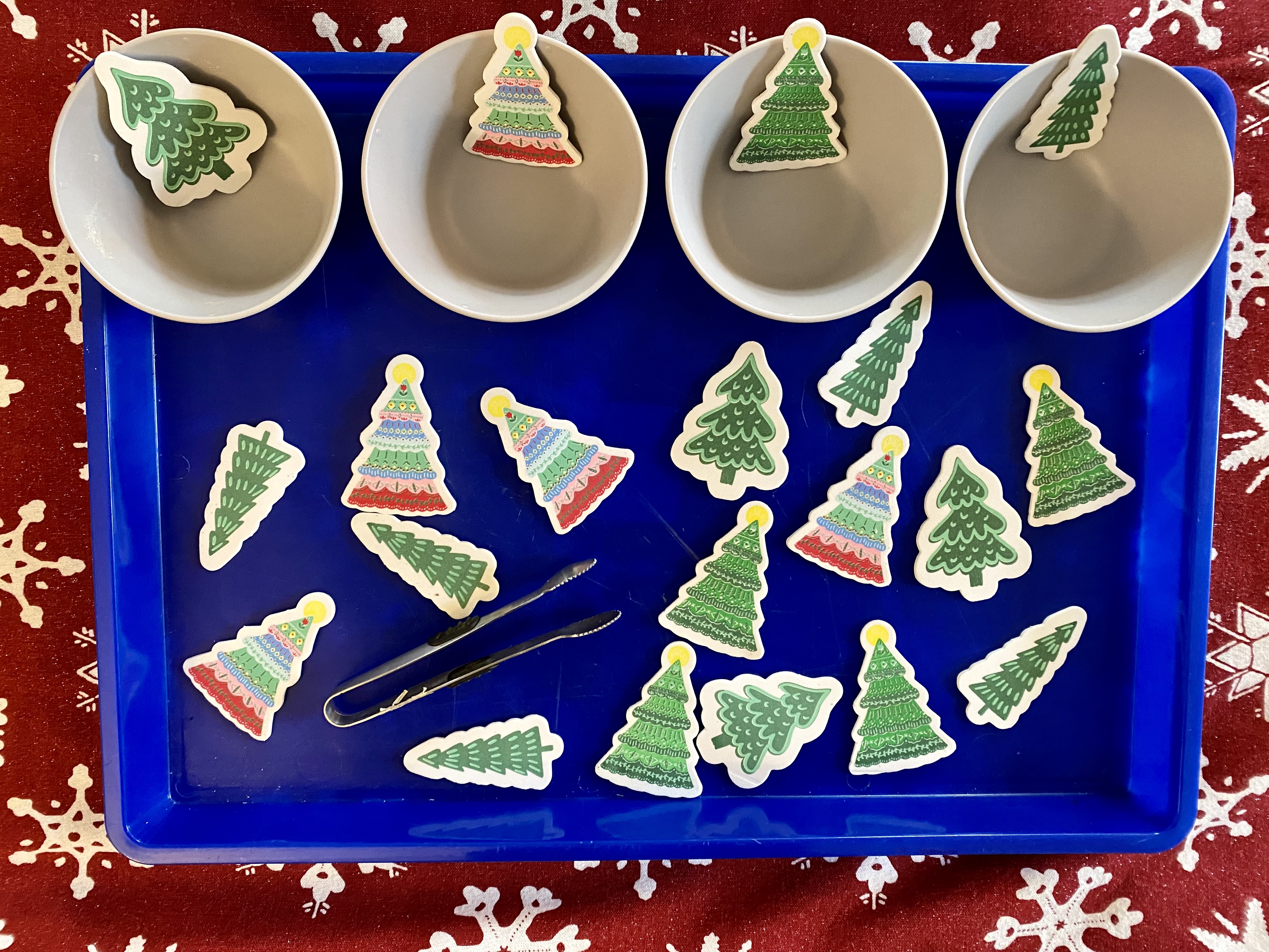 I found a great pack of foam Christmas tree stickers at Michael’s and grabbed them with the intention of creating this Christmas tree discrimination sort. Emmett found this a little too easy and lost interest. He just turned five- I would say this activity is more suitable for a 3 or 4 year old preschooler.