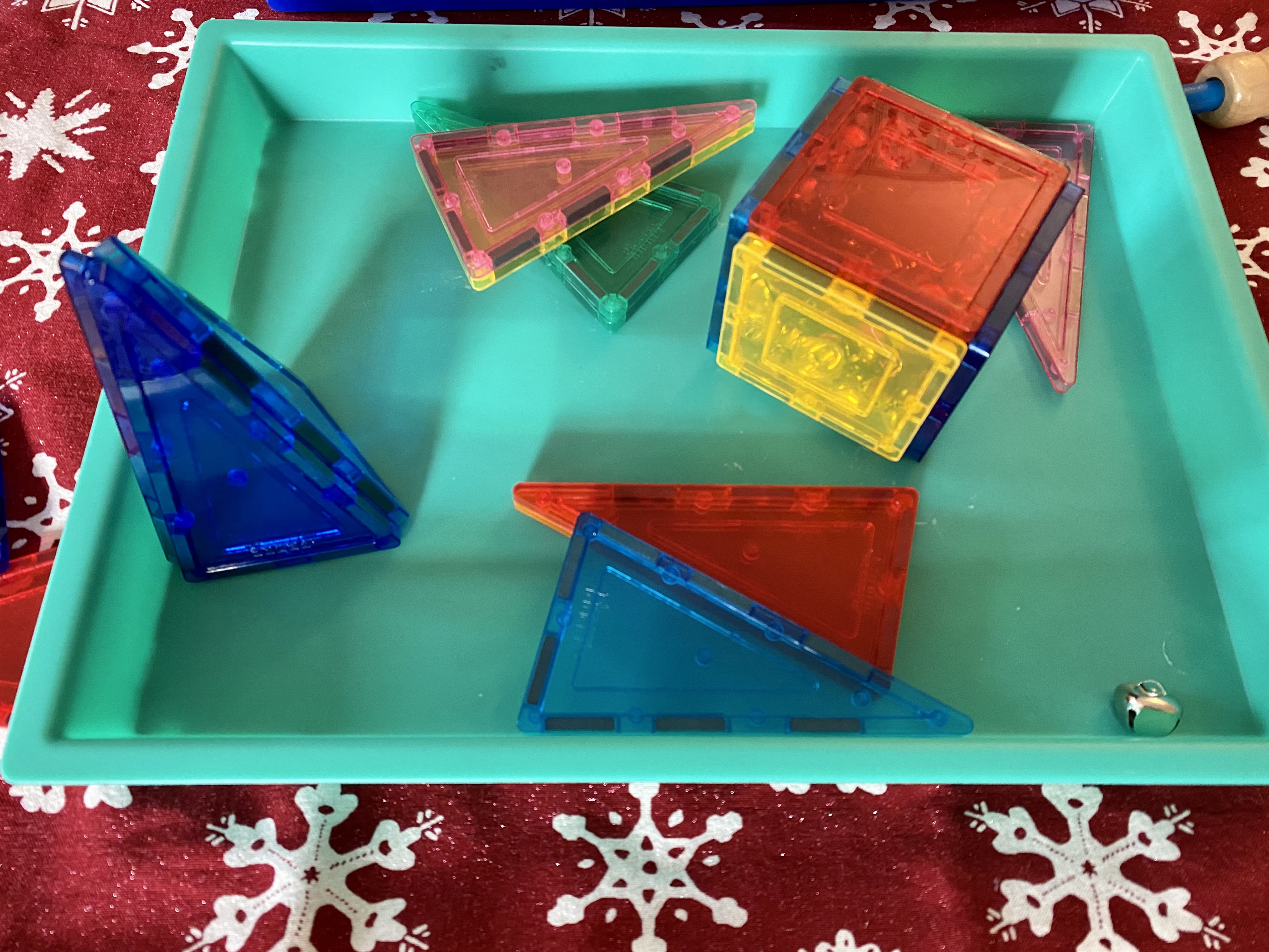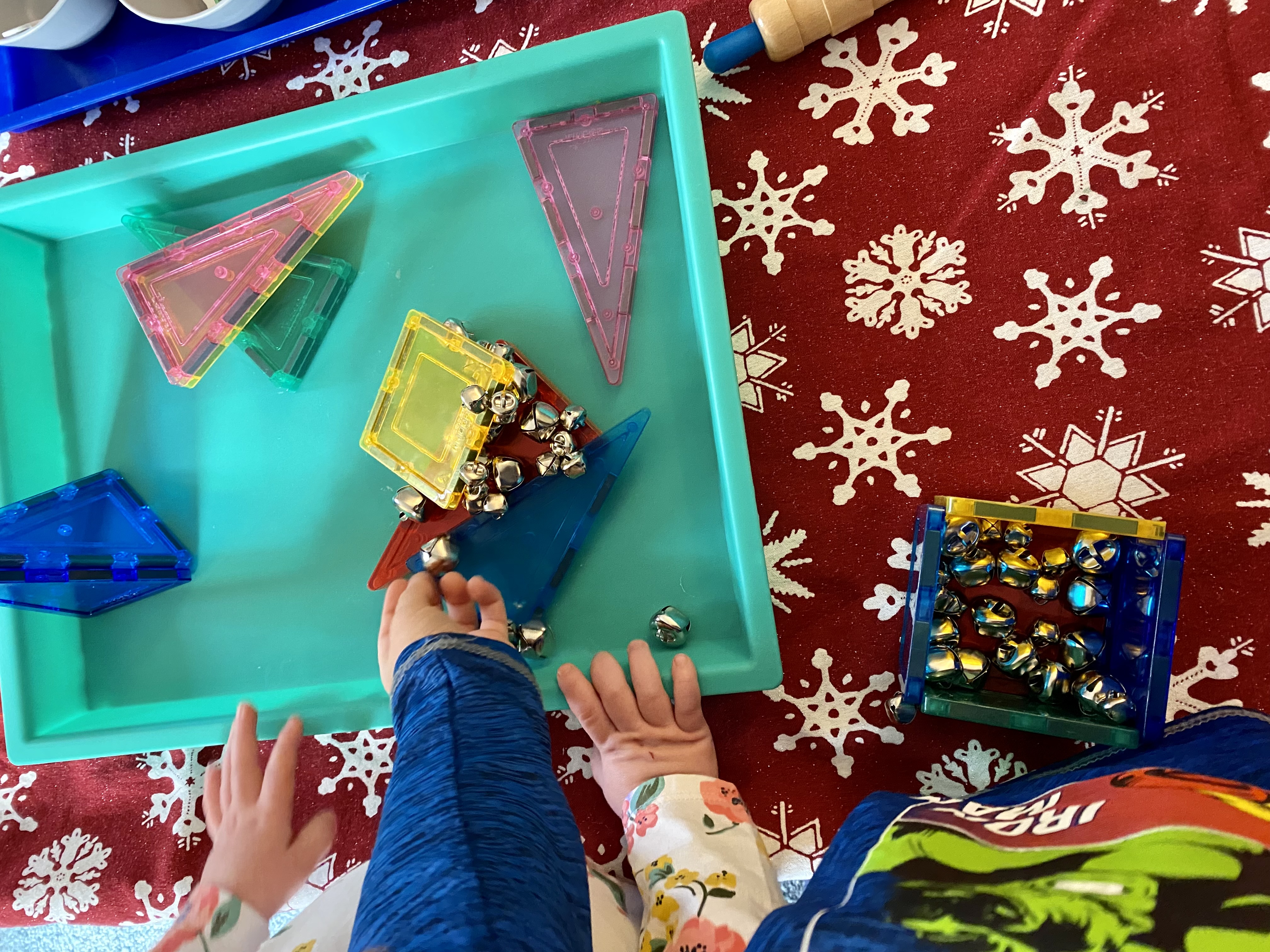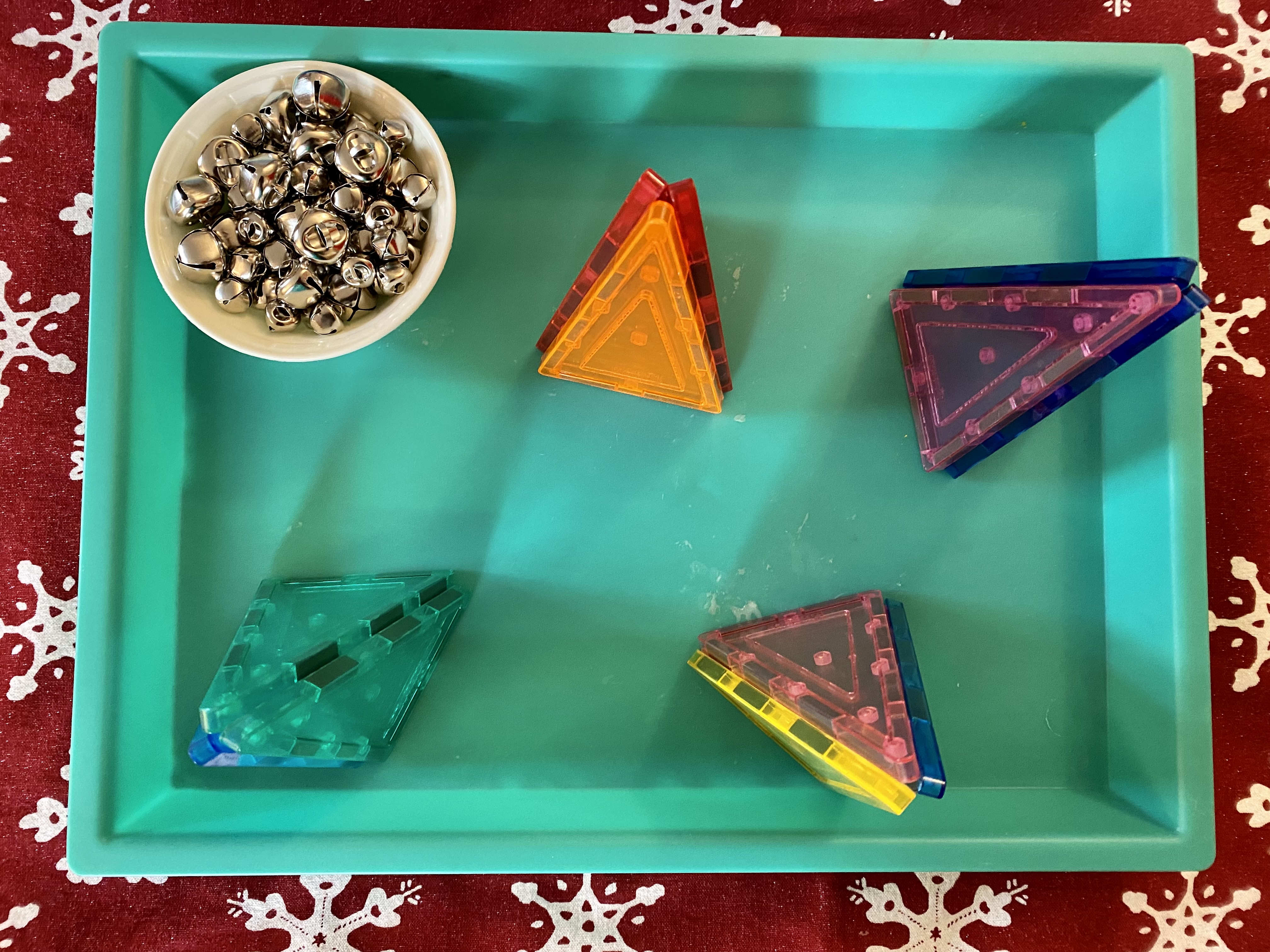 Next, I set up the tall, thin triangles from our Picasso Tiles pack to look like little Christmas trees. I challenged Emmett to figure out how many bells he could hang on each tree. He did this challenge rather quickly then made it his own.