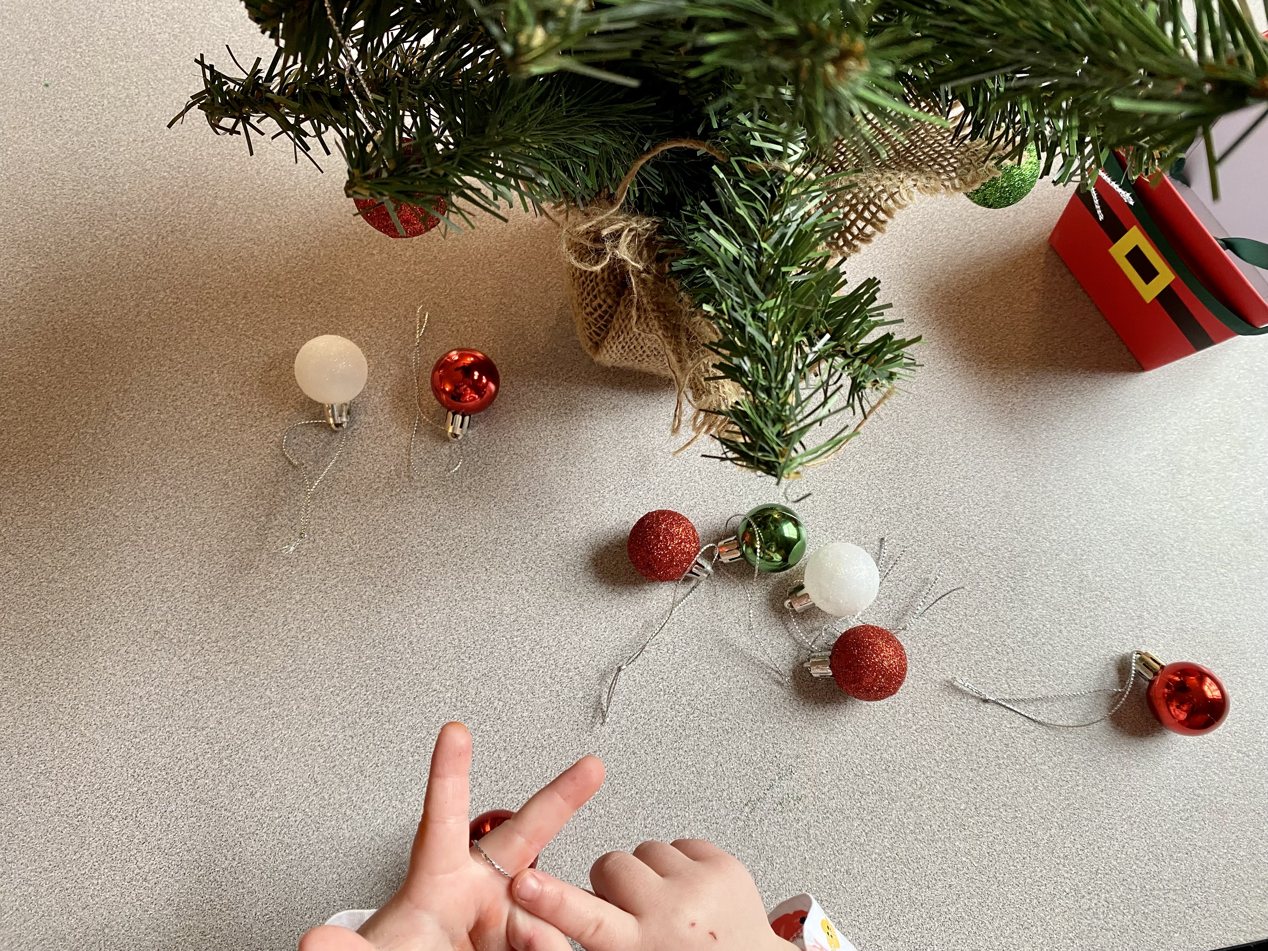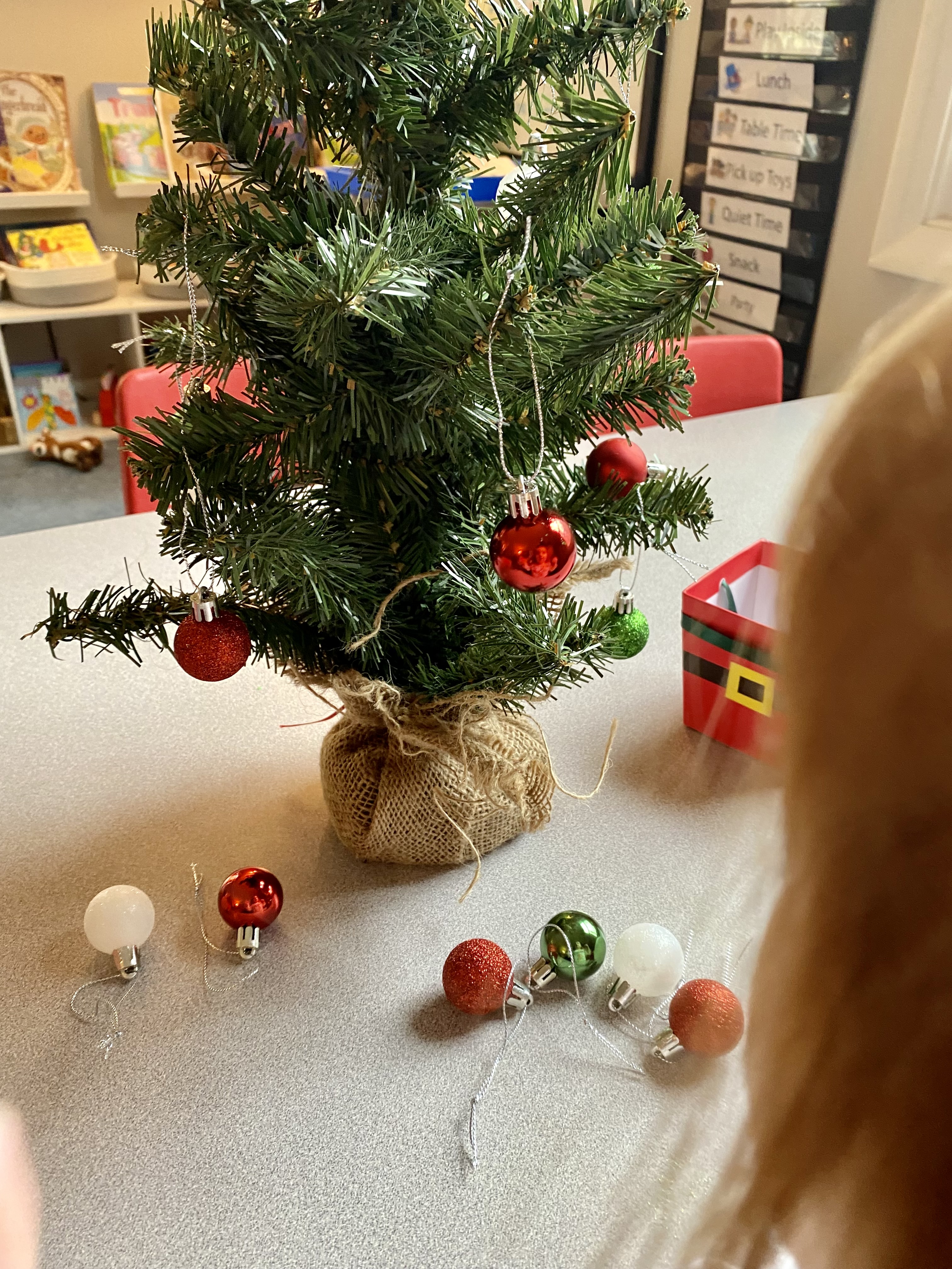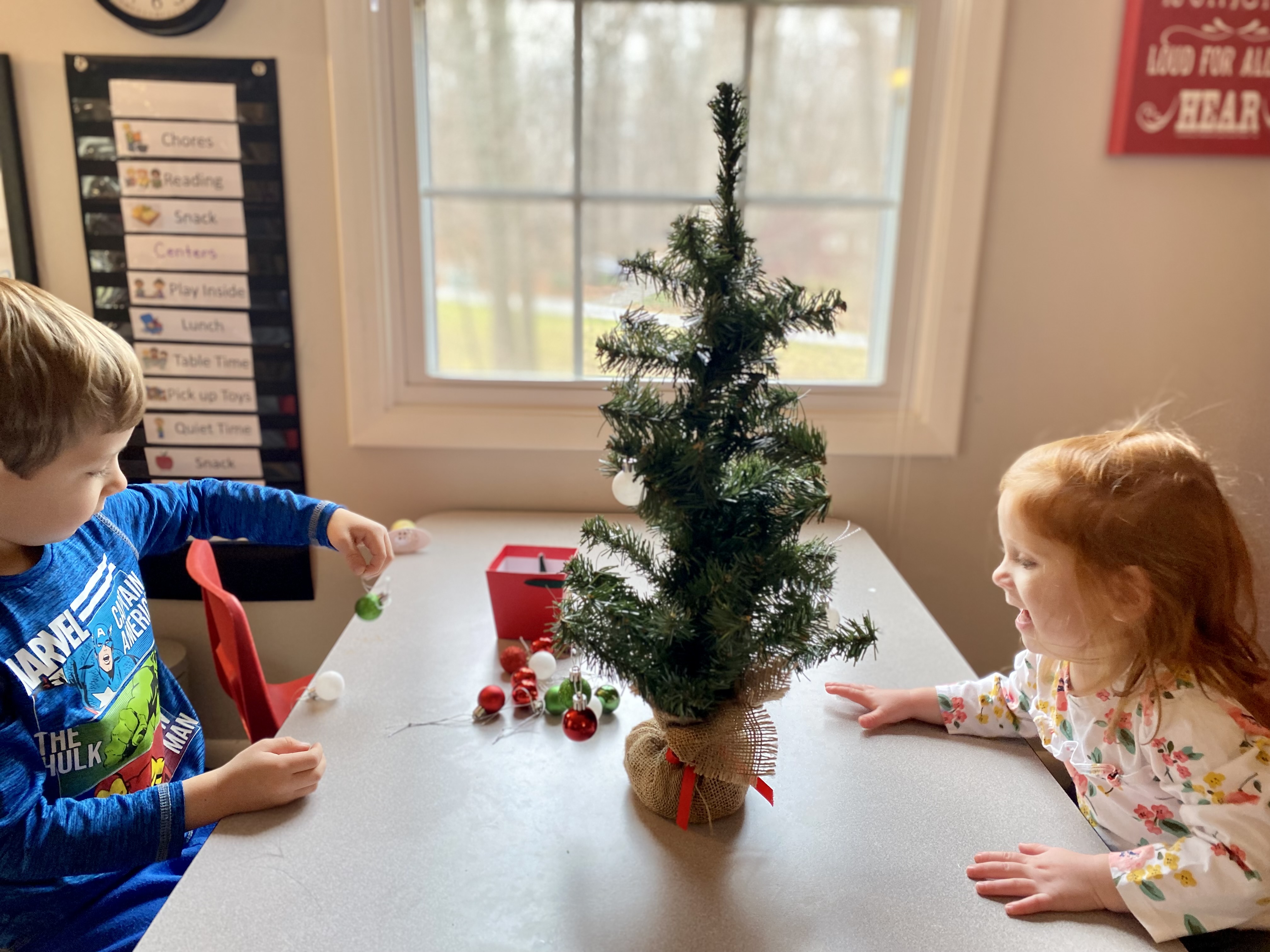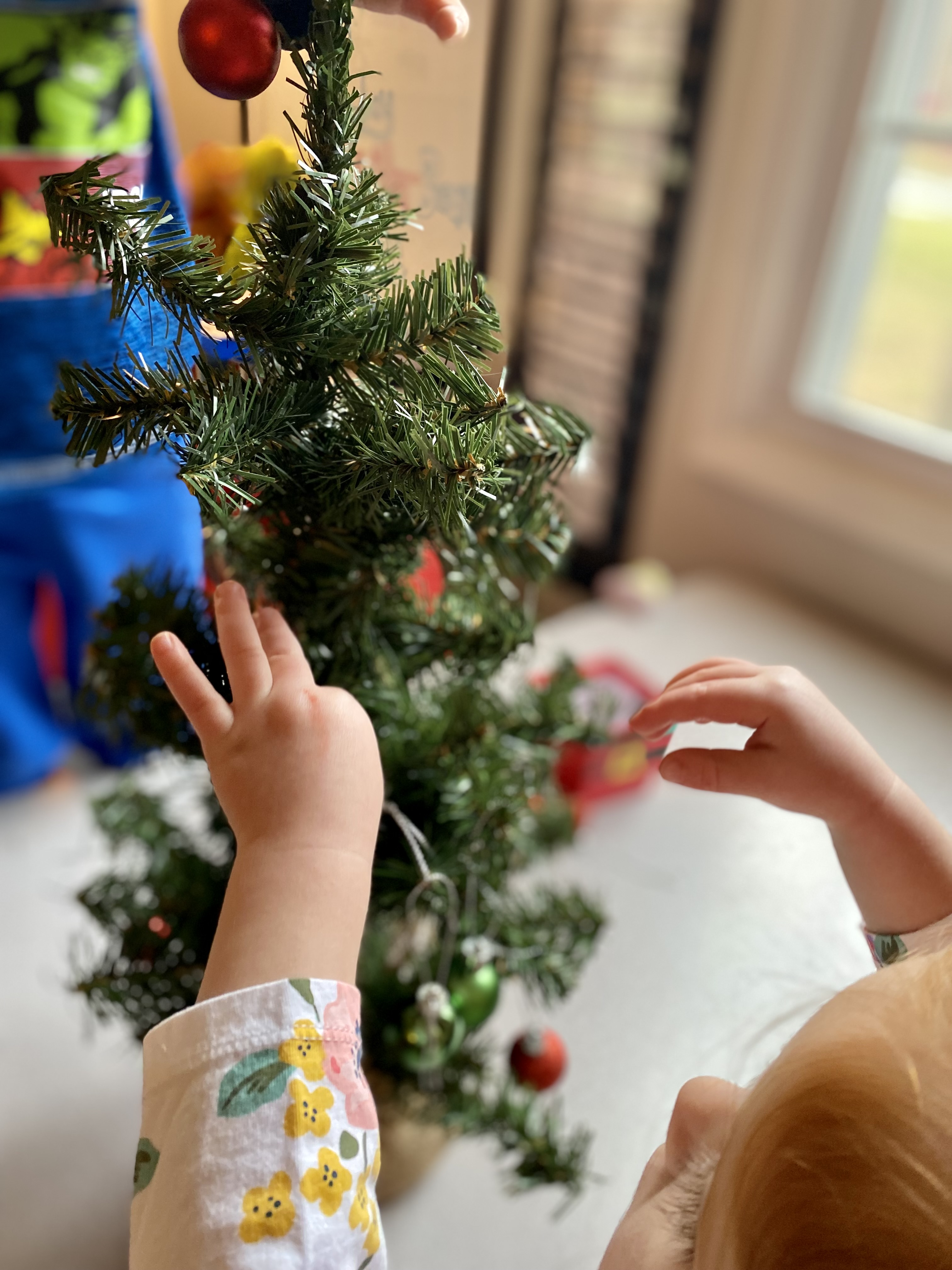 Our final Christmas tree activity was a simple invitation to decorate a Christmas tree. I set out a small tree that I already had in our decorations and a set of shatter proof Christmas ornaments. Emmett helped decorate for a few minutes, but Lillian sat here quite a while decorating and redecorating the tree. Then I left it out in the playroom to do and redo again.