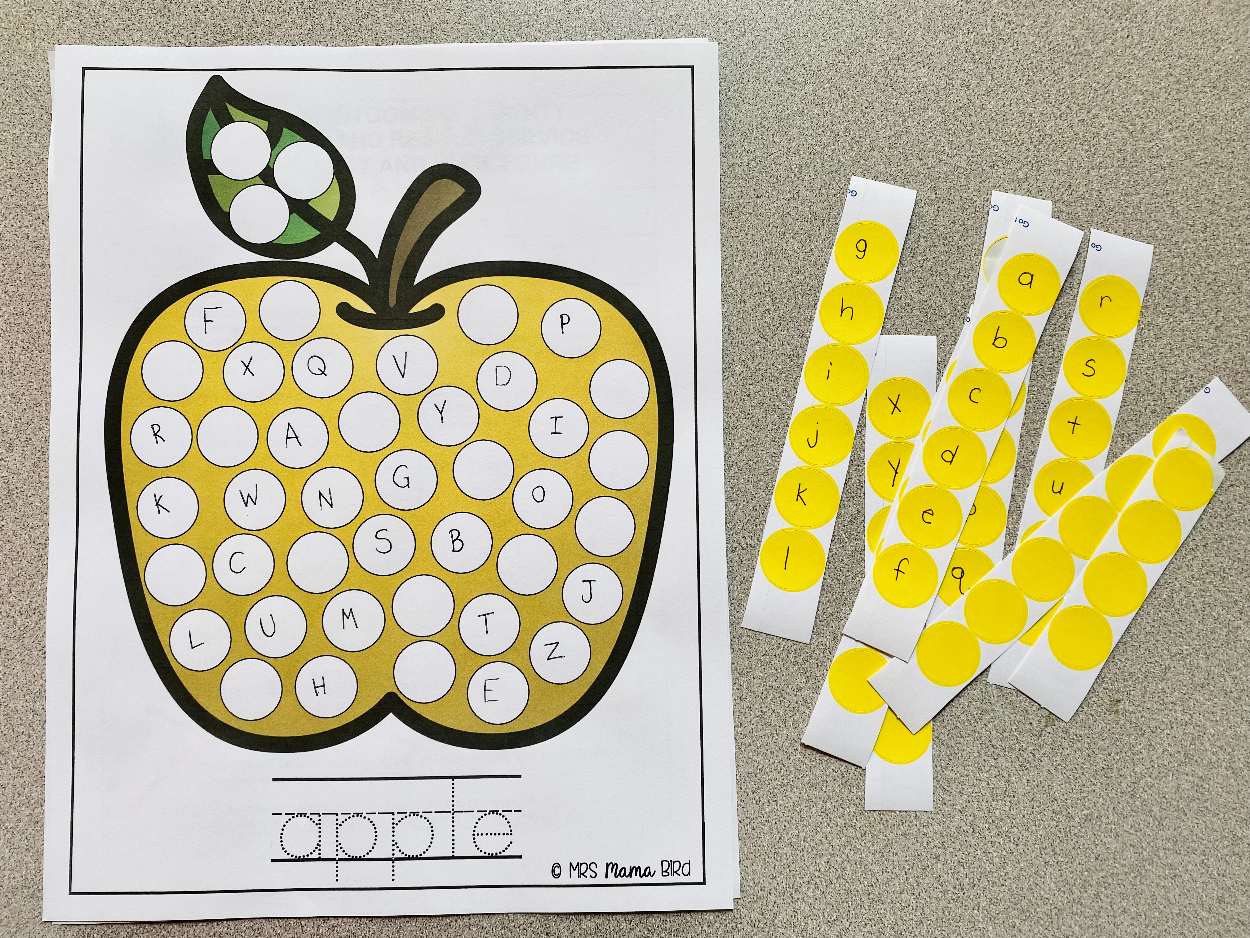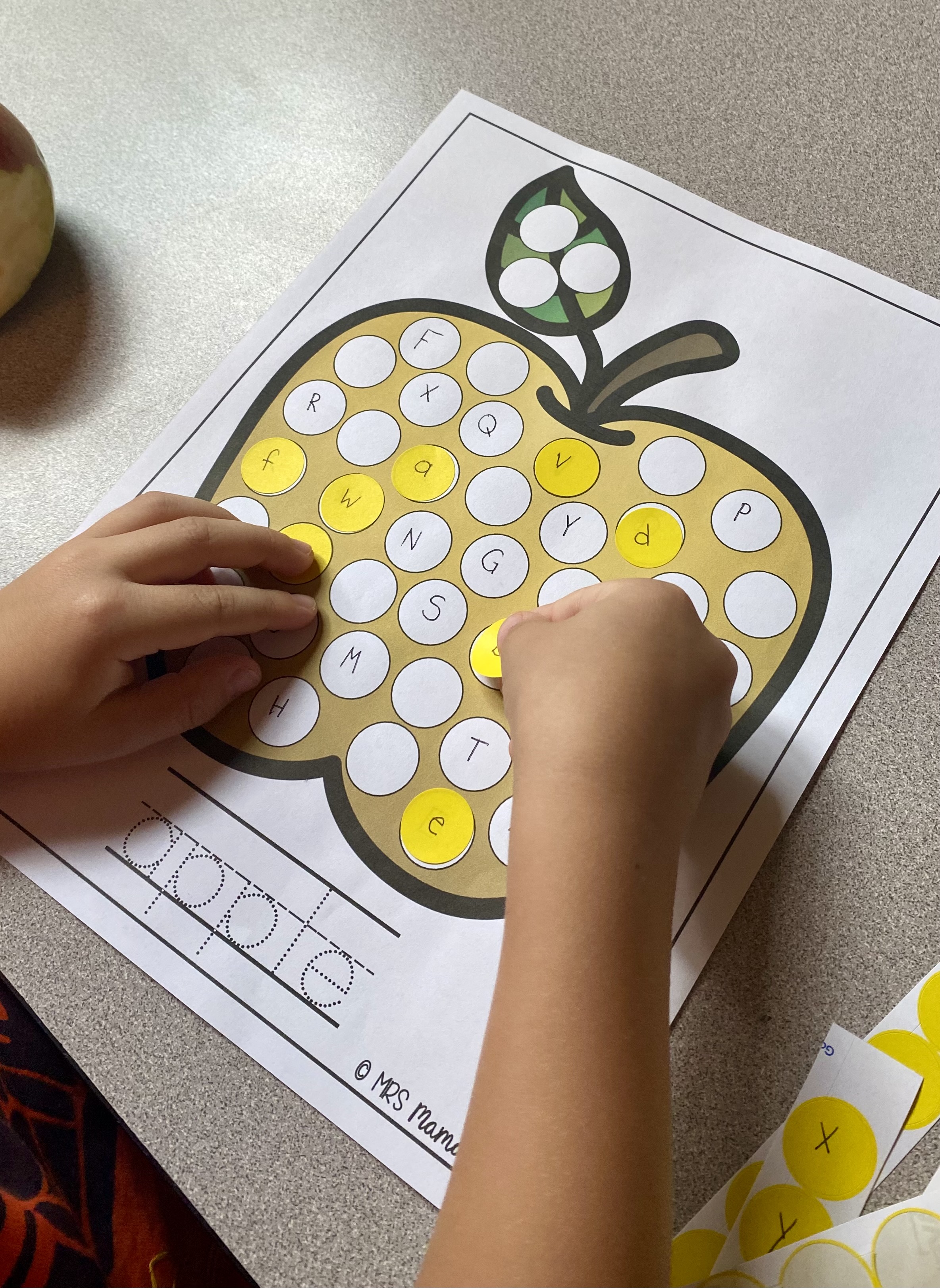 I also want to mention that when I set this activity up, I only included 12 letters of the alphabet. I find that including all the pieces at once is cumbersome for my daughter and she does much better matching the letters and their beginning sound shapes when there are not as many pieces.