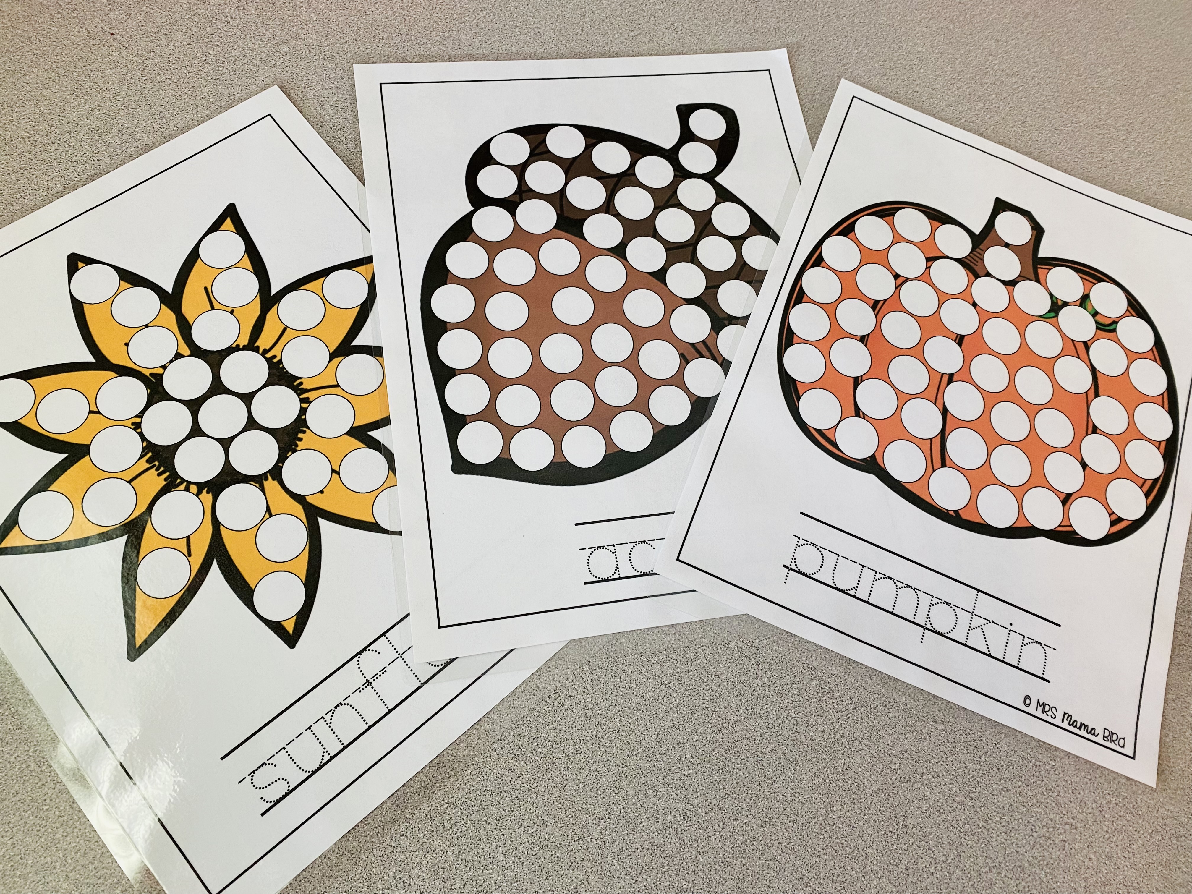 Or you can set it up like a “write the room” activity and display the acorn counting cards around the room. Have your preschoolers find a card, count the acorns and trace the number on their recording sheet. There are 3 recording sheets to choose from (1 – 10, 11 – 20 or 1 – 20) so that you can cater to your learners’ needs.