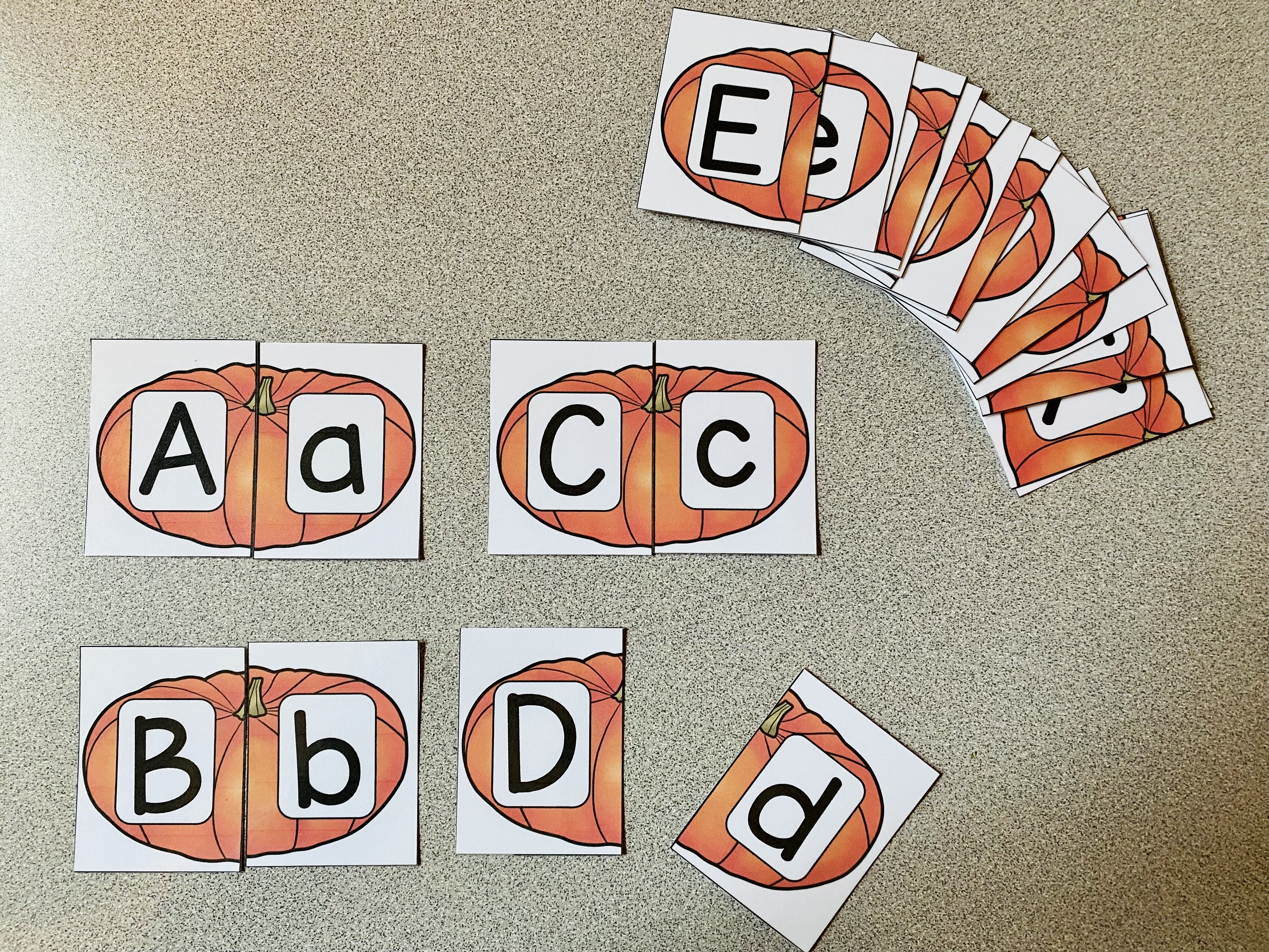 I decided to set this letter sound match center up like a pumpkin patch. I used kinetic sand as the ground and spread it evenly in a deep plastic tray that I purchased at Michaels. Kinetic sand is one of my favorite sensory activity mediums because it isn’t sticky!!! It doesn’t dry up if you leave it out. And if it does fall on the floor, it vacuums or sweeps right up. Kids love it too which is really the most important part.