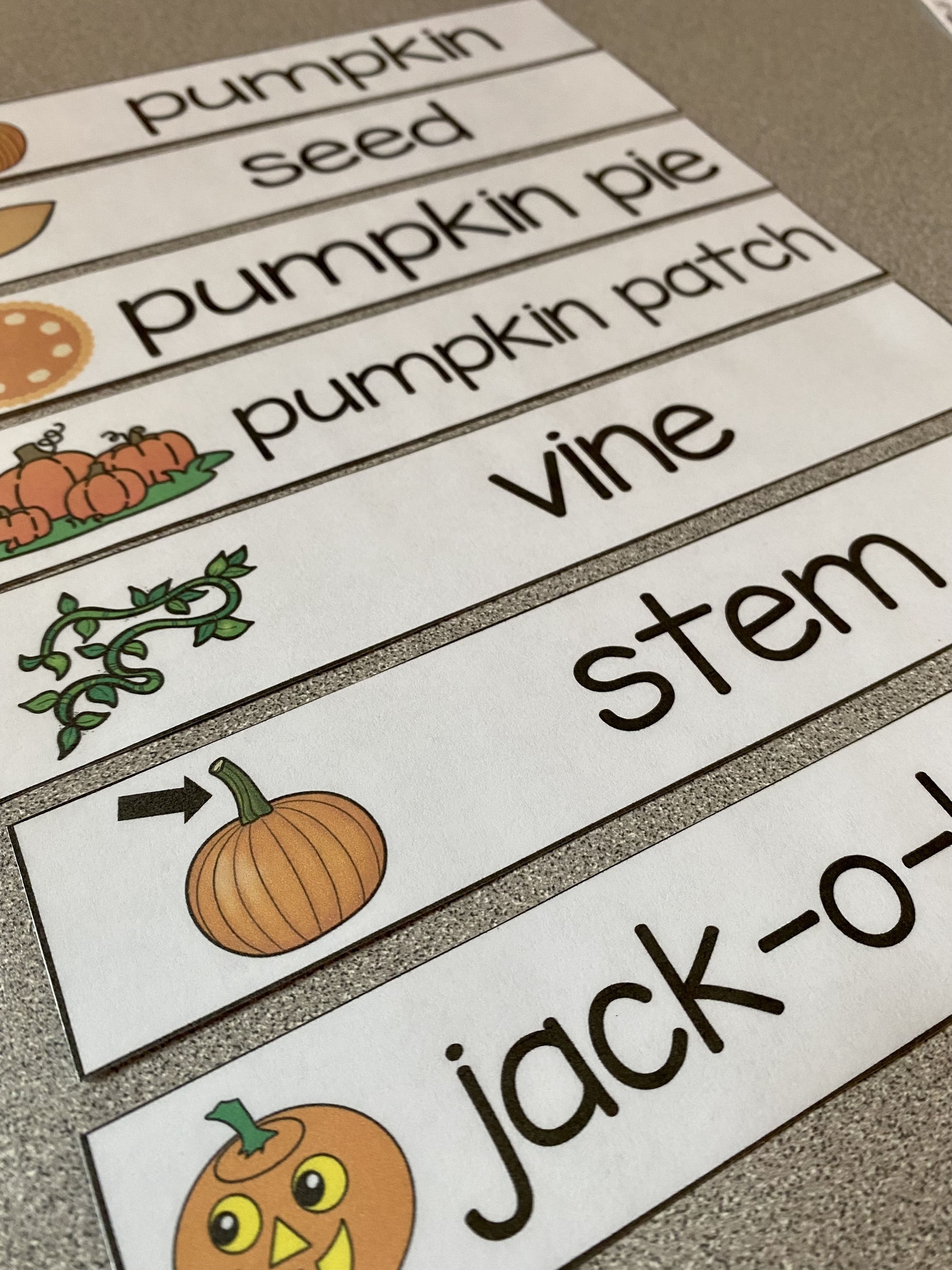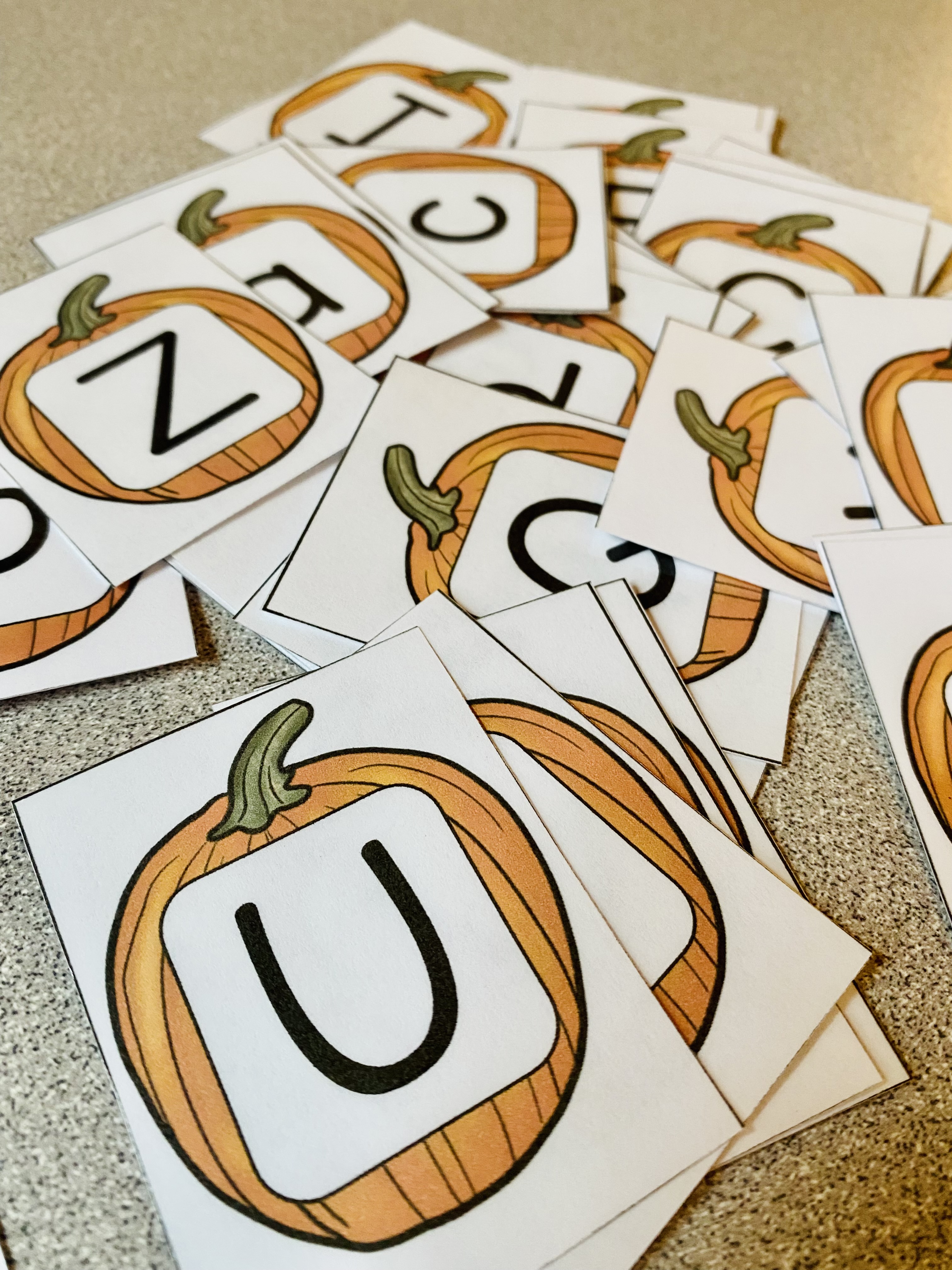 Next, I cut apart the pumpkin sound cards and positioned them in the “ground” as if they were growing in a pumpkin patch. They are staggered so that they are easy to view for the child sitting at the center. Each card depicts a pumpkin with a different picture in the middle. This activity focused on the beginning sound of each picture. In order for my preschooler, Emmett, to keep track of the letter sounds he found, I printed the letter mat and set it next to the “pumpkin patch” of pumpkin sound cards. This kept Emmett’s sound cards organized as he picked each pumpkin and identified the beginning sound of the picture.