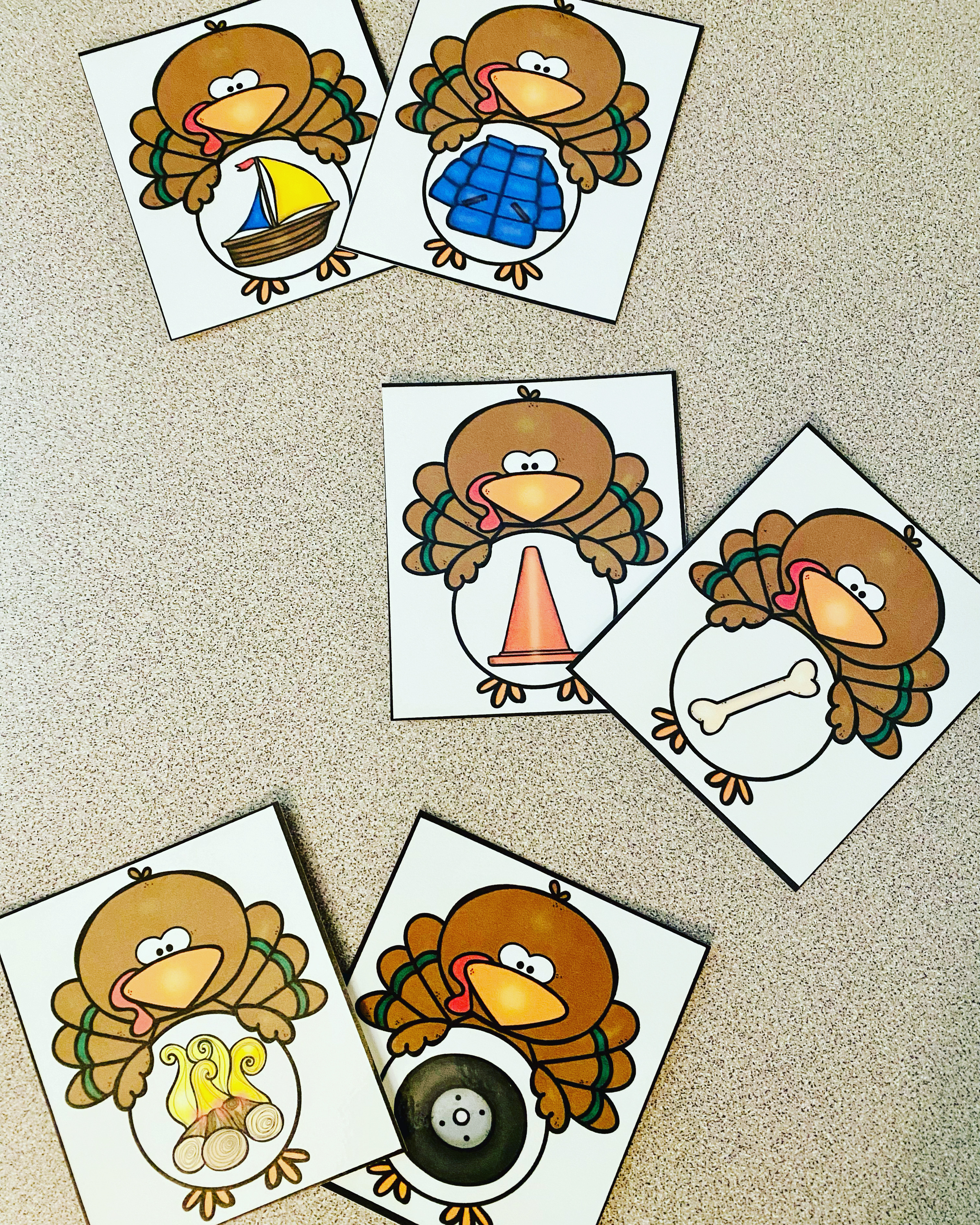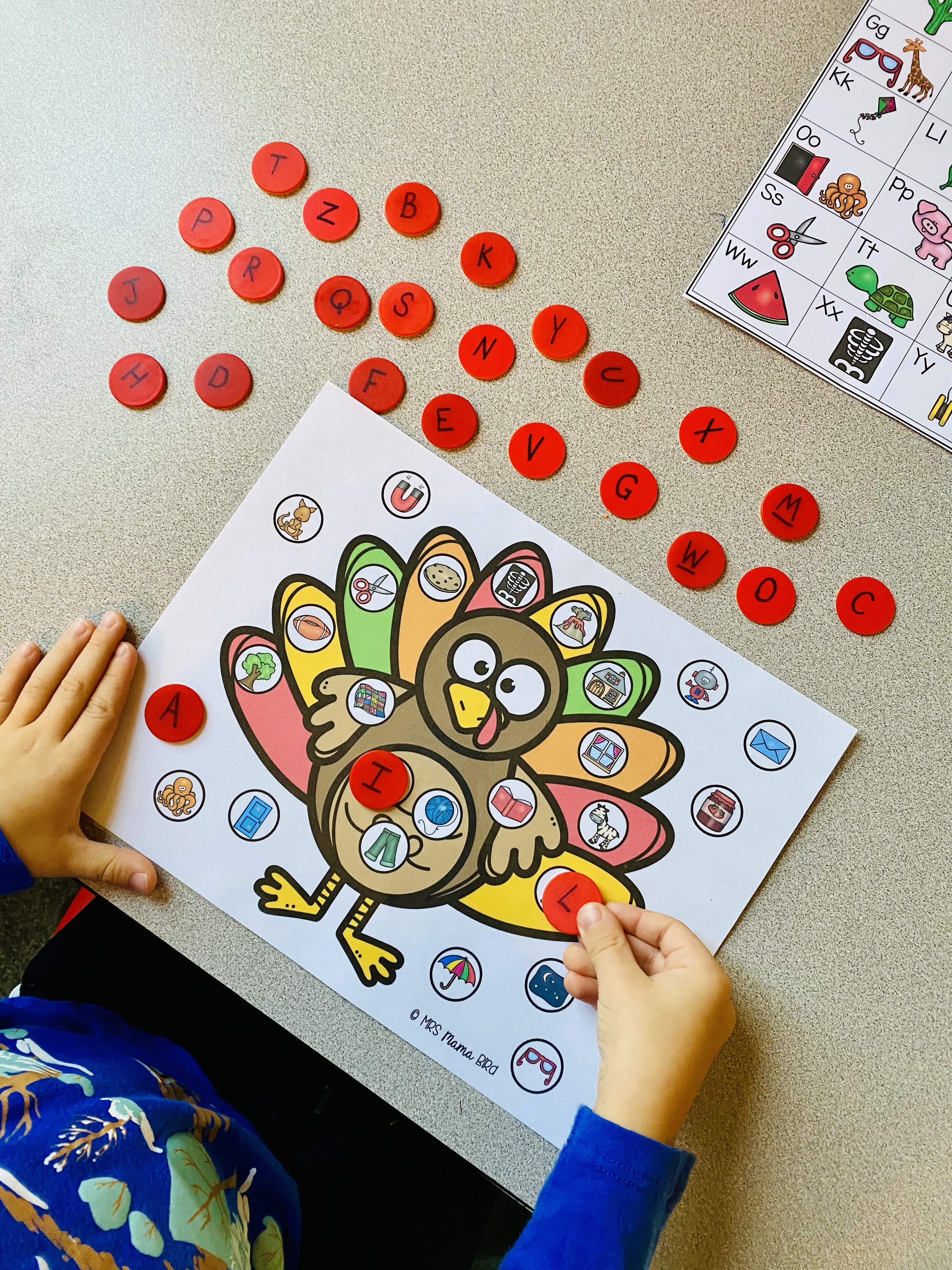 Finally, we practiced beginning sounds with this Turkey Sounds Cover Up activity. Emmett was excited to practice identifying the sounds at the beginning of each picture on the turkey. I wrote letters on simple plastic BINGO chips, but you can use anything you’d like to cover up the pictures, including alphabet erasers, playdoh and alphabet stamps, alphabet tiles, etc.
