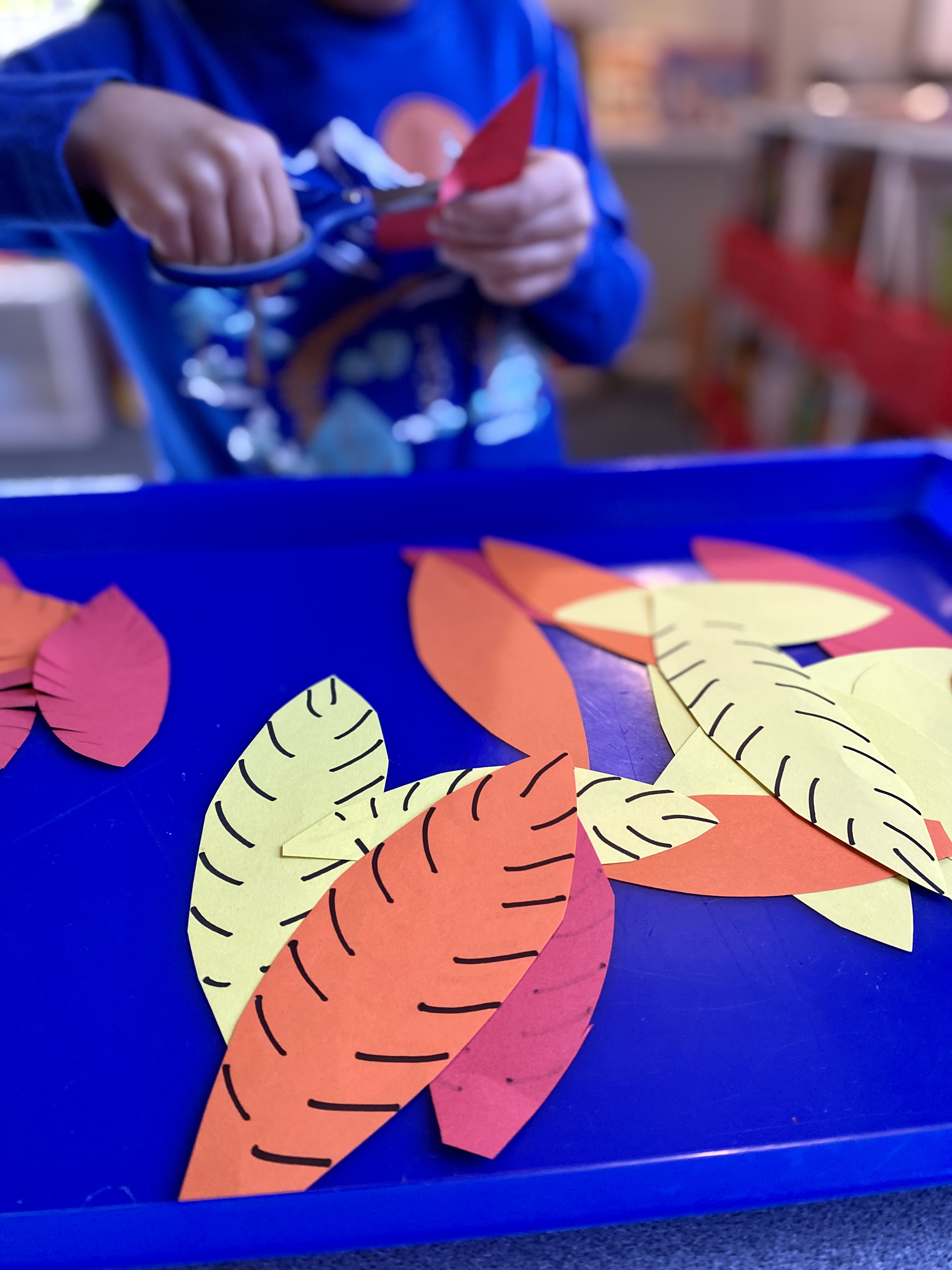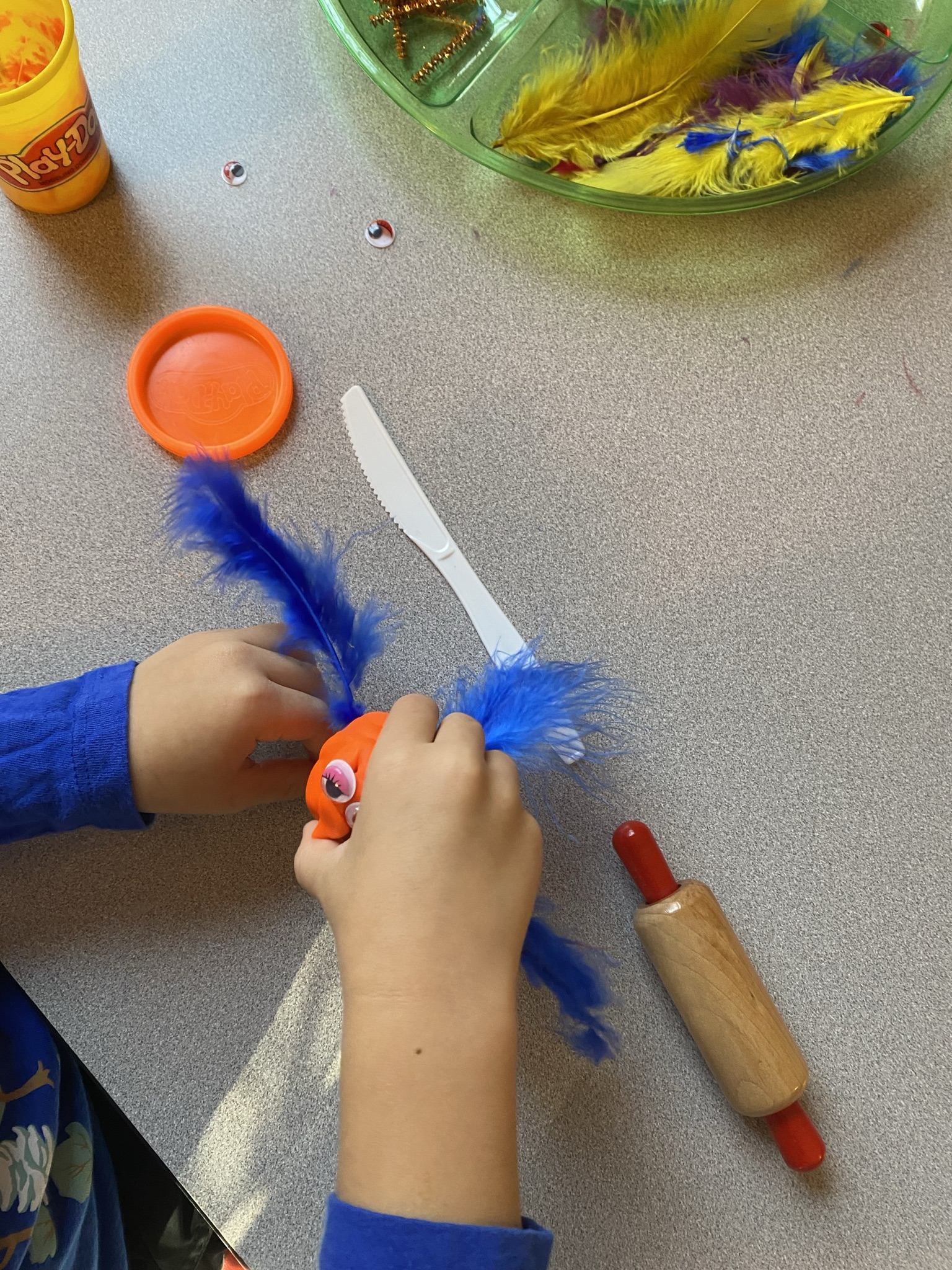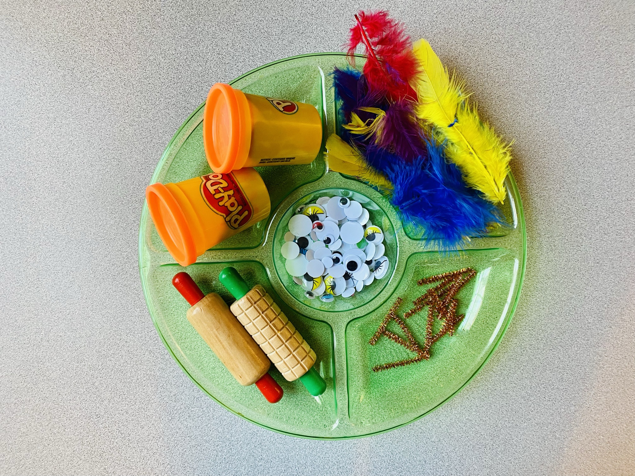 Our first activity was an invitation to create a playdoh turkey using items in our loose parts tray. Our tray included craft feathers, playdoh, rollers, googly eyes, and orange pipe cleaners. My intention was to prepare brown playdoh for the turkey’s body, but sometimes you just run out of time! There’s always next time.