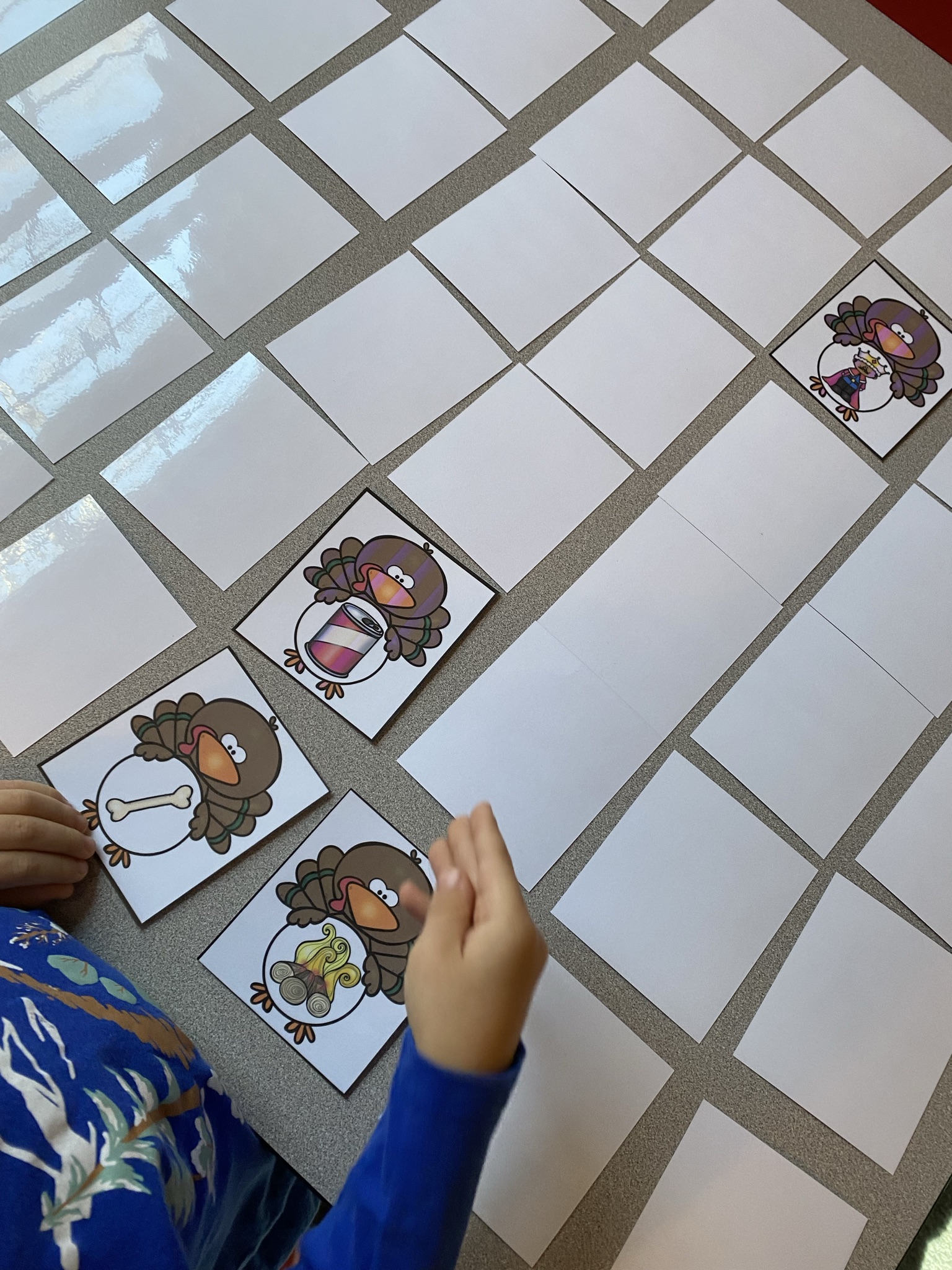 Our next activity came from Playdough To Plato, another fantastic blog. These turkey rhyming cards are FREE and you can find them HERE if you would like to use them as well. Emmett is just getting the hang of rhyming words and he loves matching games so this activity was perfect for him.